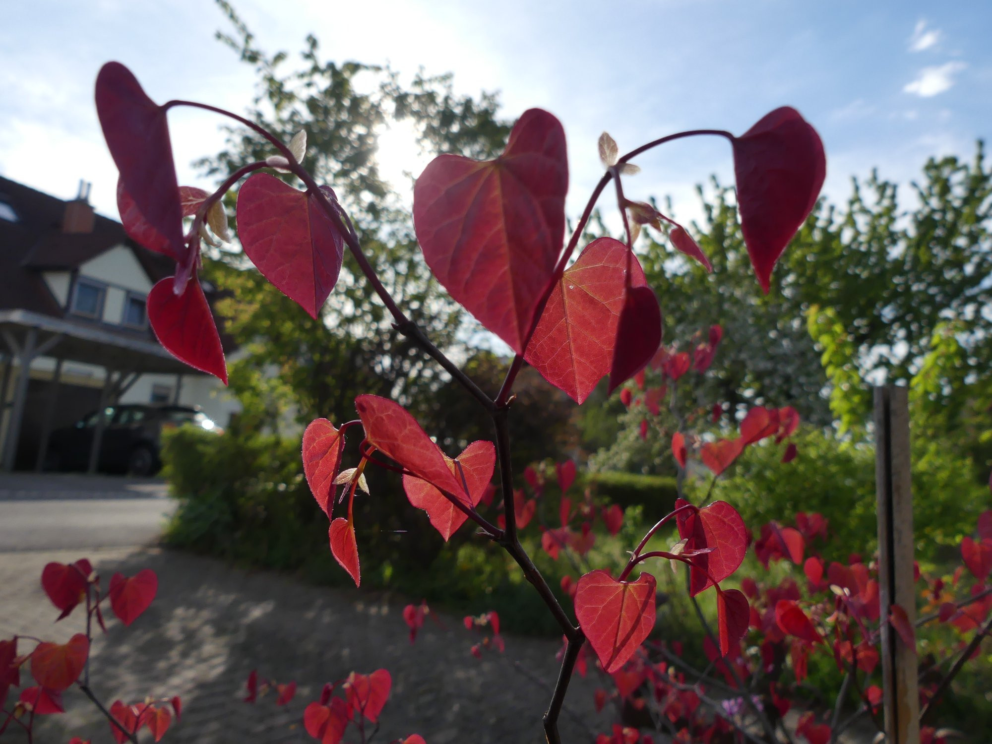 Jedoch finde ich, wenn es ein größerer Baum werden soll dann ist der Mittelmeer Judasbaum manchmal noch eine bessere Alternative. Denn ab einer gewissen Größe ist es gar kein Nachteil mehr, wenn der Blatt austrieb schon kurz nach Beginn der Blüte beginnt, wenn man einmal unter diesem Baum steht und nach oben blickt, so leuchten ein die kreisrunden Blätter regelrecht an, zumal das Blattwerk auch mehr außen gebildet wird und nicht im Inneren und somit die Blüten Pracht zur Geltung kommt. Denn Grün konstratiert die pinke Blüte besser als ein Blauer Himmel.
