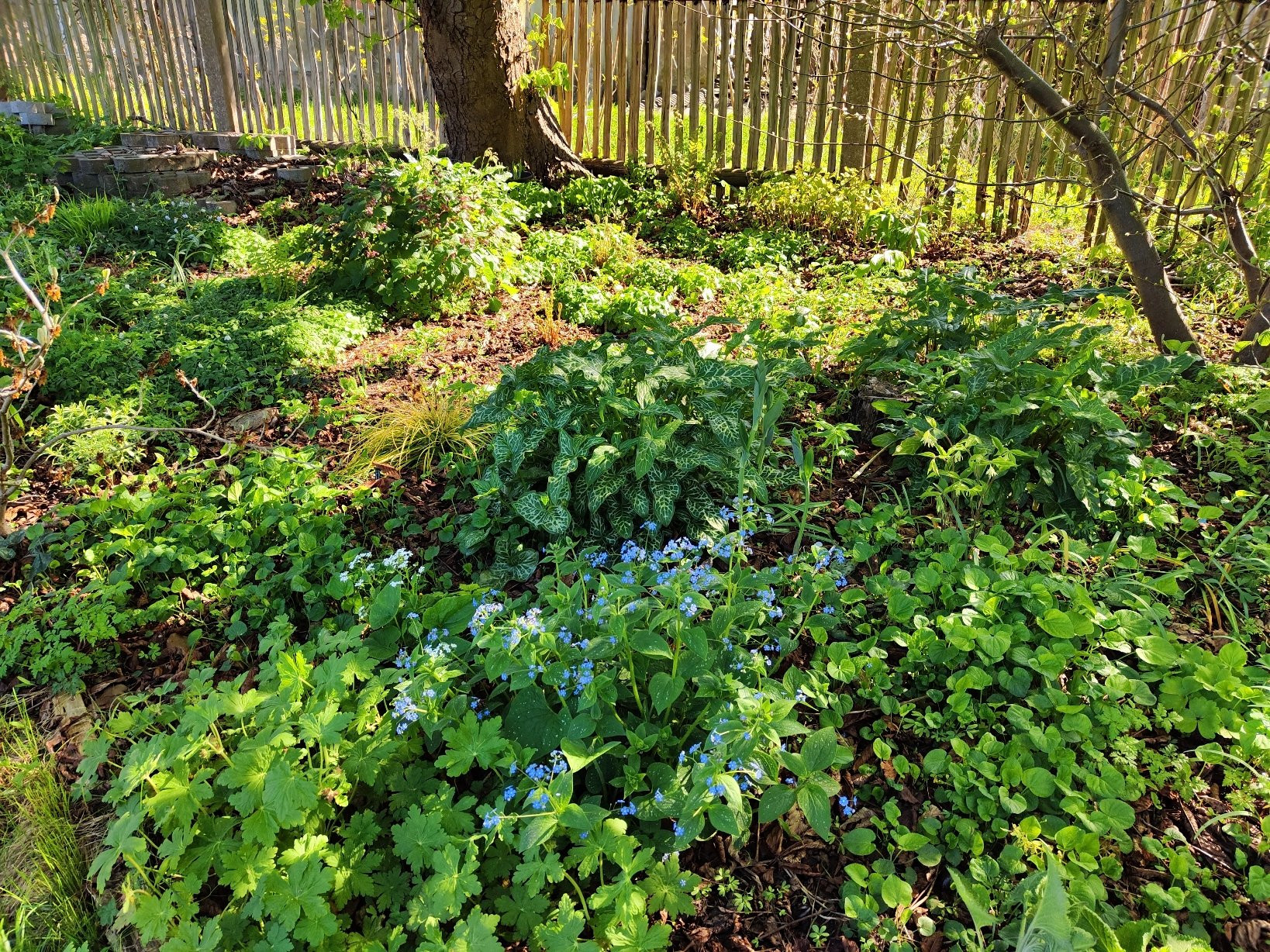 . Mein Obst- und Gemüsebeet sieht oft etwas wild aus. Momentan ist es eine Gierschfarm mit Vergissmeinnicht und ein paar Obststräuchern: