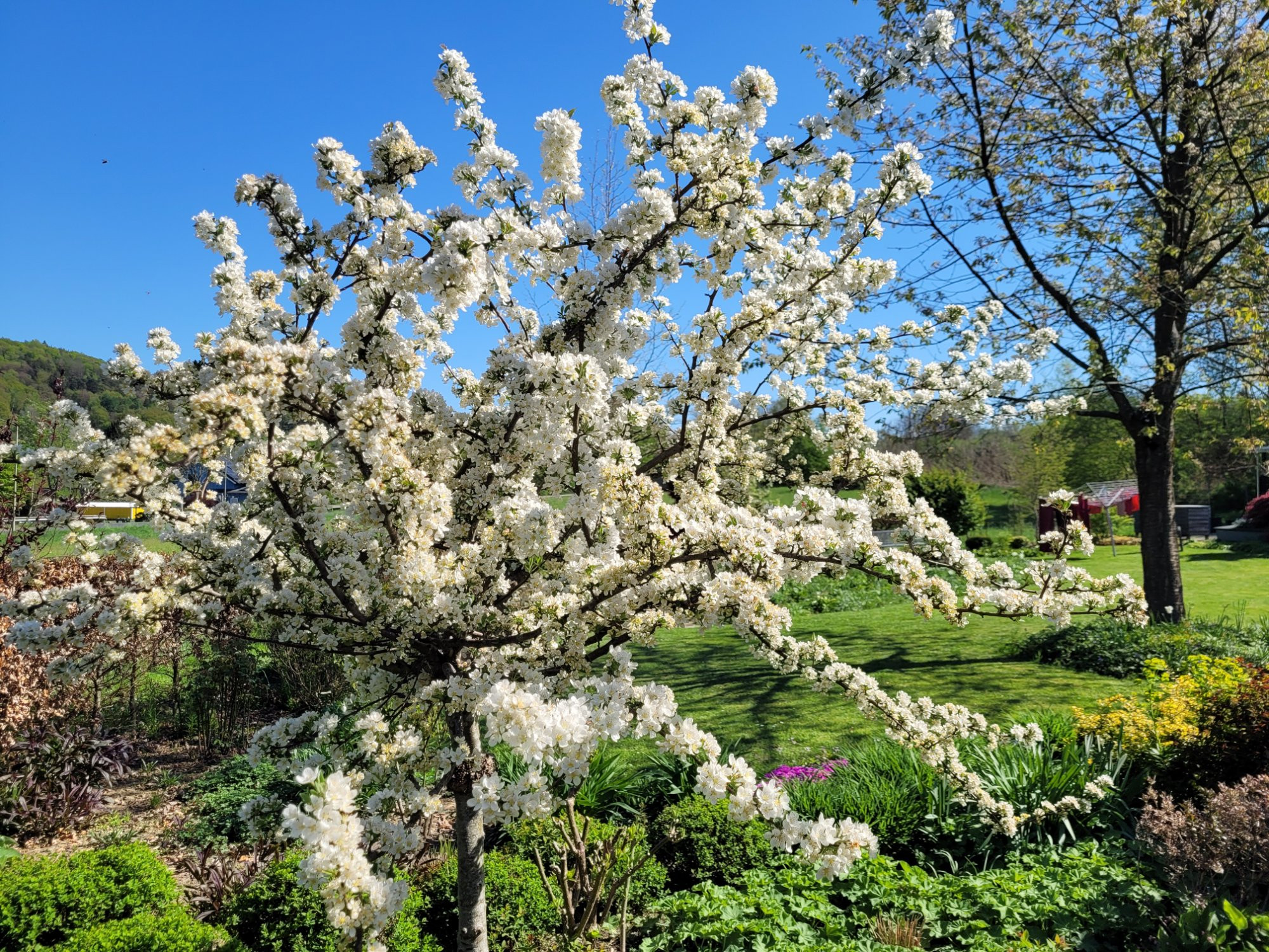 Hier blüht nun über und über der kleine Malus 'Tina', allerdings schneeweiß.