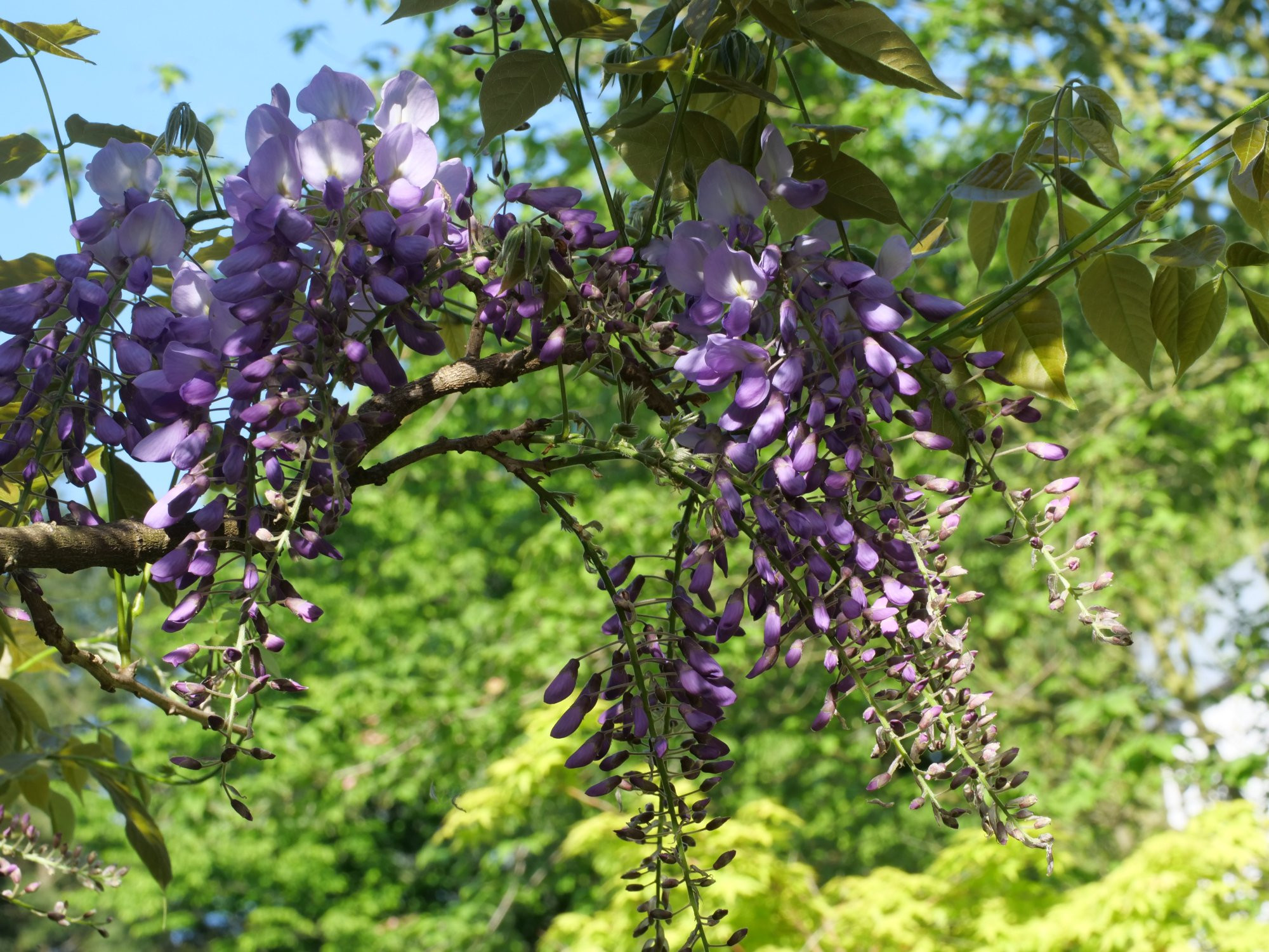 Hier blühen die Wisteria, Eunonymus alatus compactus und eine erste Akelei.