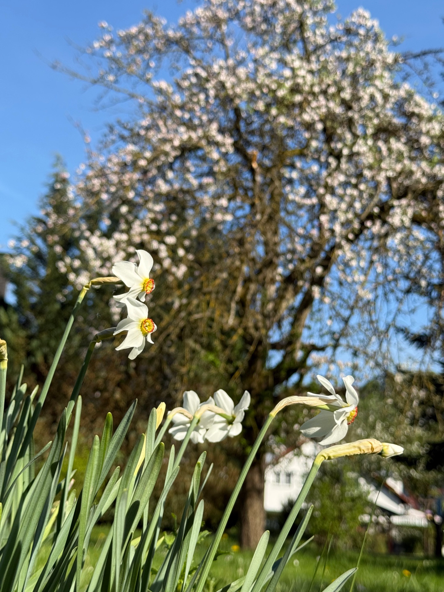 Naricussus poeticus recurvus und der Saft Apfel beginnen zu blühen, dieser ist immer etwas später dran mit der Blüte vllt trägt er deshalb jedes Jahr :