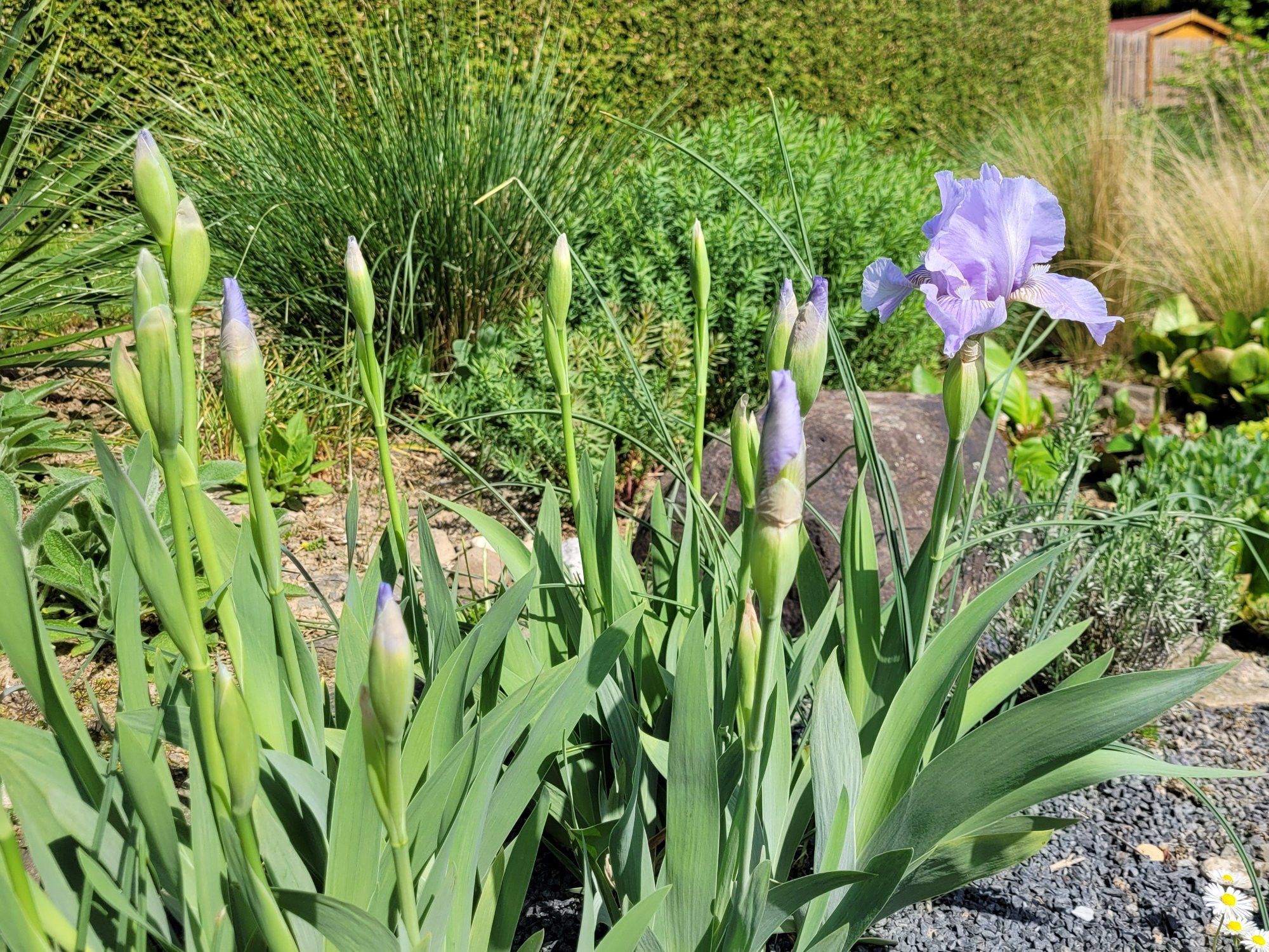 Im Steppenbeet blüht immernoch der Rosmarin, dazu gibt es die erste Blüte von 'Morgendämmerung '. Hier die früheste Bartiris und eine meiner Lieblinge.