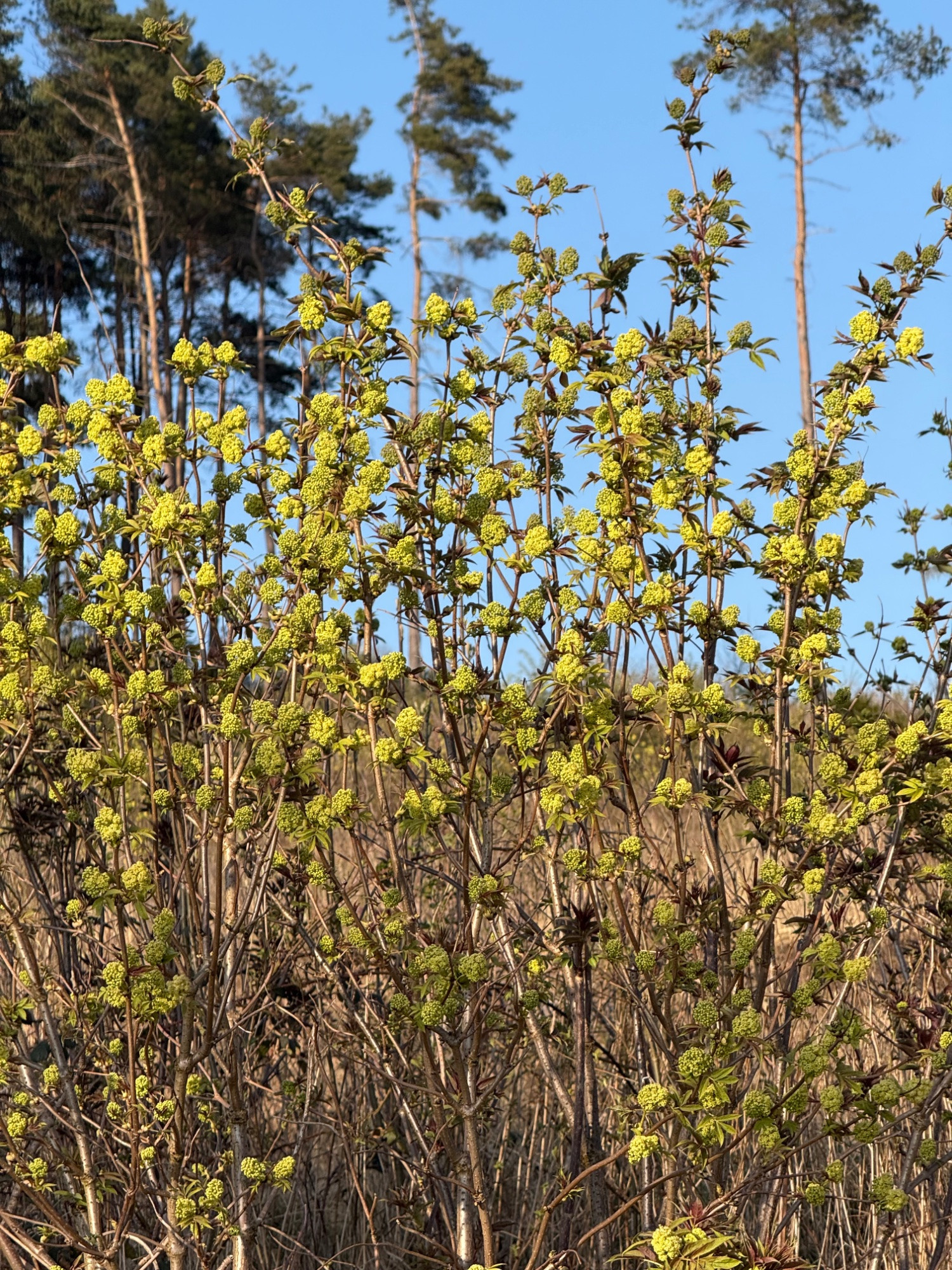 Kiefern und Heidelbeeren, die den Boden bedecken: roter Holunder zu tausenden in den Kalamitätsflächen Und eine Streuobstwiese in der Abenddämmerung es blühen aber nur die Schlehenhecke die Äpfel ruhen noch