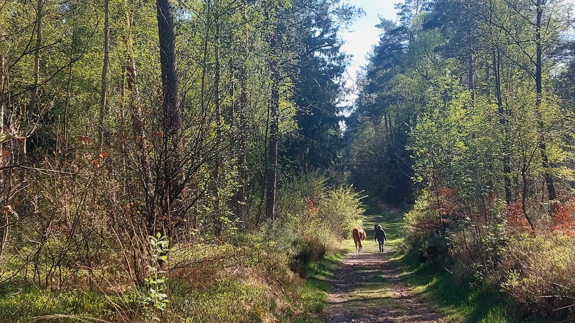 Osterspaziergang gestern durch ( schon längst ) vom Eise befreiten Forst - frisches Birkengrün, Pferd, Sternmiere.