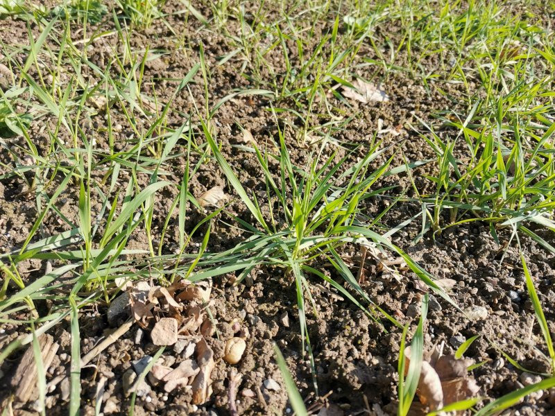 Roggen als kaltes Gras ist da anders, breitet nach dem durchstoßen der Oberfläche recht schnell ein erstes Blatt als Sonnensegel aus, beschattet also den Boden, nimmt die Aufprallenergie von Regentropfen raus und verhindert auch somit Erosion und Verschlämmung, bestockt gut, wächst auch wenn es kalt ist und braucht eben wie gesagt nicht viel Pflege. Das schnelle dicht machen vom Bestand ist das schöne beim Roggen, das verhindert Unkrautwachstum, durch Lichtentzug. Also wenn da ein Rispengras oder Schaumkraut keimt, es wird bis zu einem gewissen Grad vom Roggen `überwuchert´.