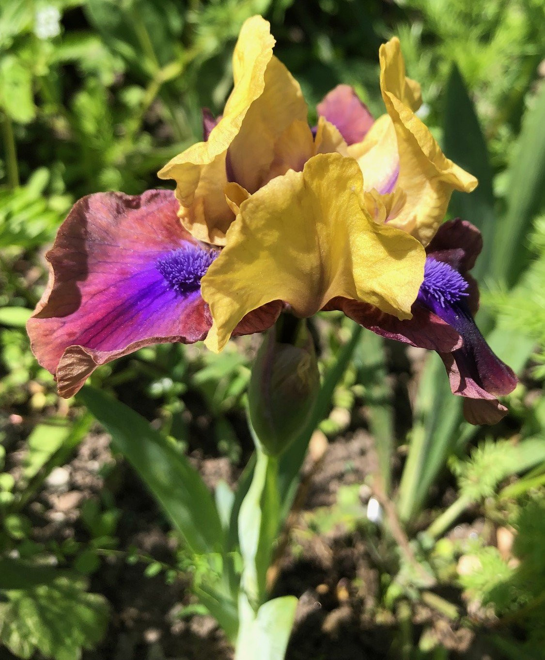 Seit zwei Tagen blüht hier (Nähe Magdeburg) eine Iris barbata-nana, die ich nicht anhand der einschlägigen Online-Kataloge bestimmen konnte. Hat jemand eine Idee? Habe auch vermutet, es wäre vielleicht eine trockenheitsgeschädigte Iris barbata-intermedia, aber alle Blüten sind maximal 30 cm hoch. 'Gingerbread Man' ist es wohl nicht, da bei unserer ein klarer Unterschied des Doms (gelblich) und der Hängeblätter (rotbraun-violett) besteht. Sie existiert bei uns wohl schon seit mehr als zehn Jahren, die Quelle ist nicht bekannt. Auffällig finde ich besonders den blauen Bart.