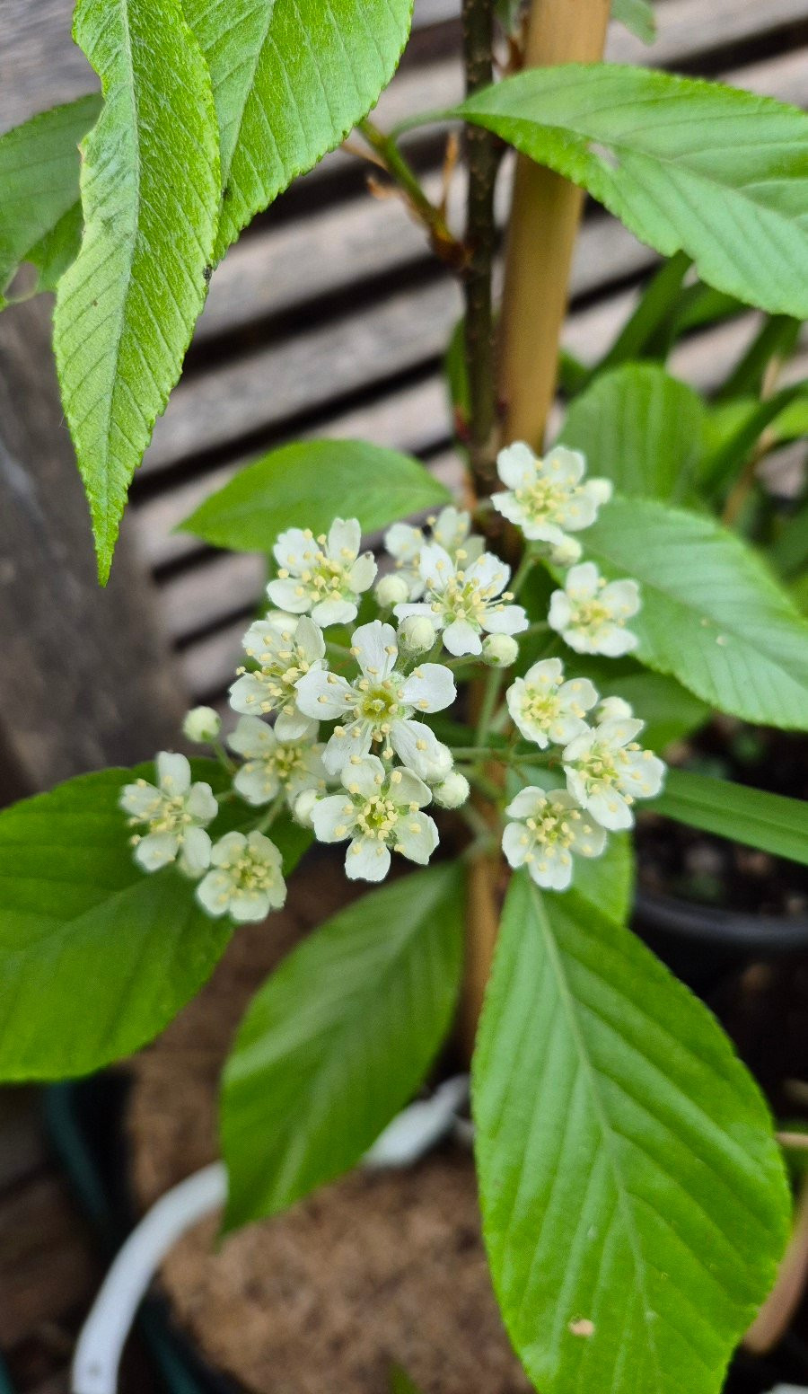 Erster Blüte bei Symplocos paniculata, Aussaat 2016 oder 2017. Leider haben die 2 andere Exemplaren noch keine Blüte. Symplocos paniculata braucht Kreuzbestäubung von eine ander Pflanze (genetisch unterschieden) um Beeren zu geben.