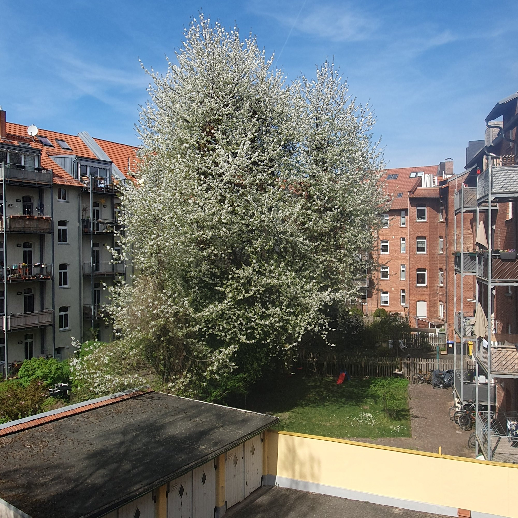 Wie jedes Jahr ein Foto von der Wildkirsche bei uns im Innenhof und ja die Garagen sind hässlich.