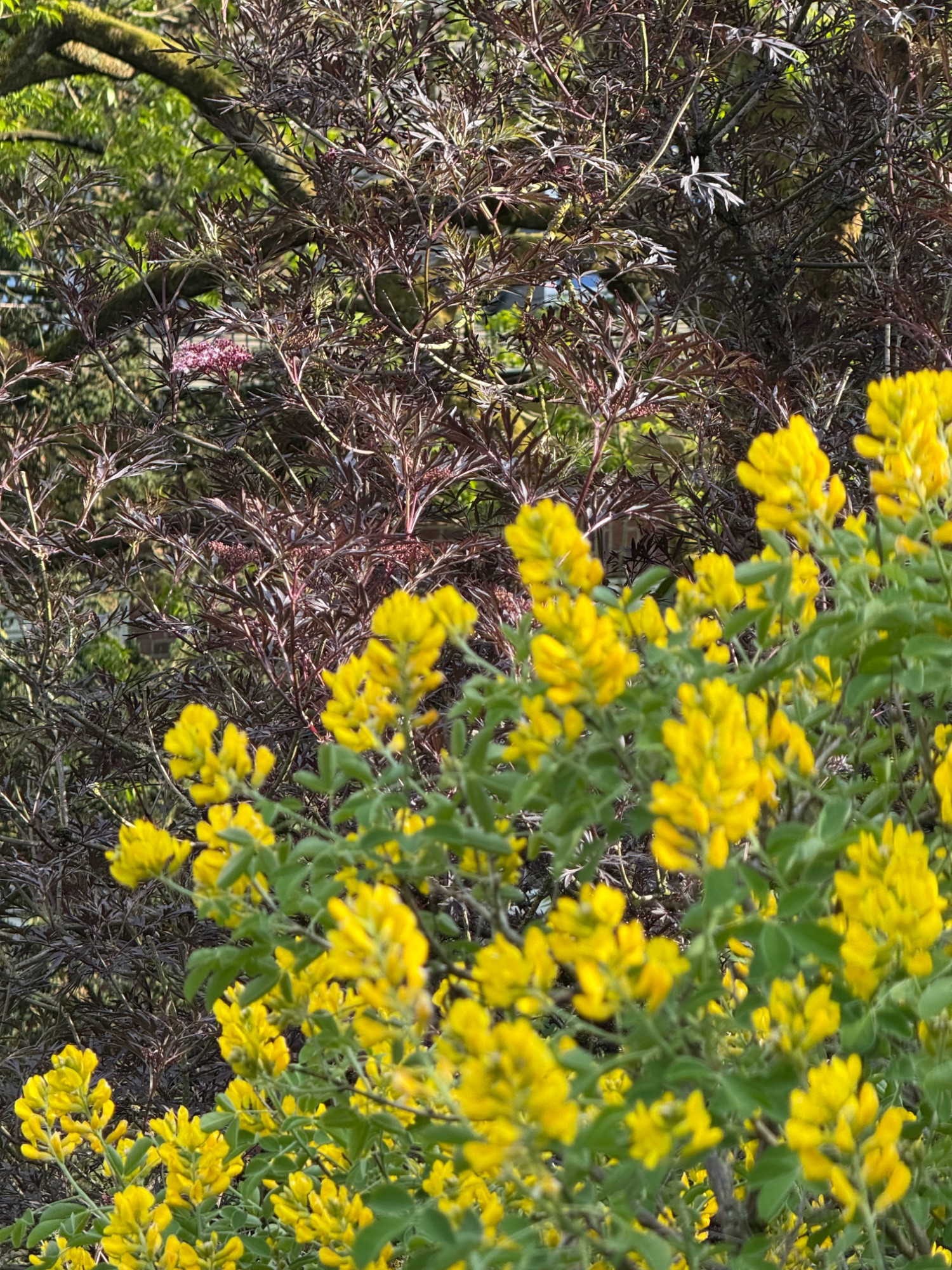 Jedenfalls sind schwarz blättrige Pflanzen ziemlich gute Hintergründe für gelbe Schmetterlingsblüten. Ohne es direkt zu planen, habe ich tatsächlich einen Goldregen vor einer dunkel selbigen Haselnuss gesetzt, welche aber auch nur im Frühjahr, also zum Zeitpunkt der Blüte des Goldregen dunkel ist. Mal schauen, wie es sich so entwickeln wird.