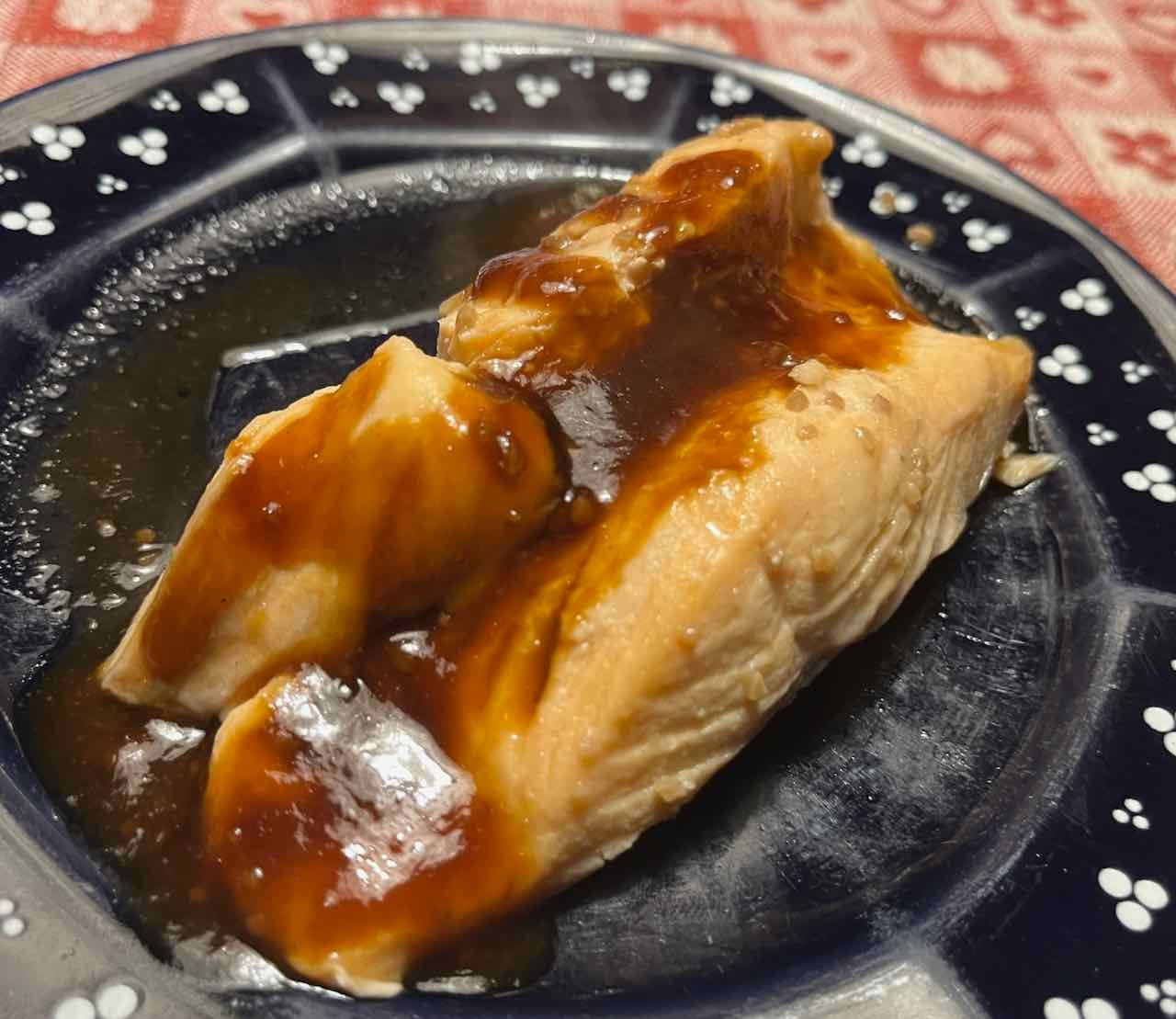 Hauptgerichte norwegisches Lachsfilet, mit Teriyakisoße, Ingwer und Knoblauch mariniert und über Weißweinschorle gedämpft sowie Fusilloni aglio e olio mit Tomatenstückchen zum Sauvignon blanc 2021 "Eva" aus Neuseeland