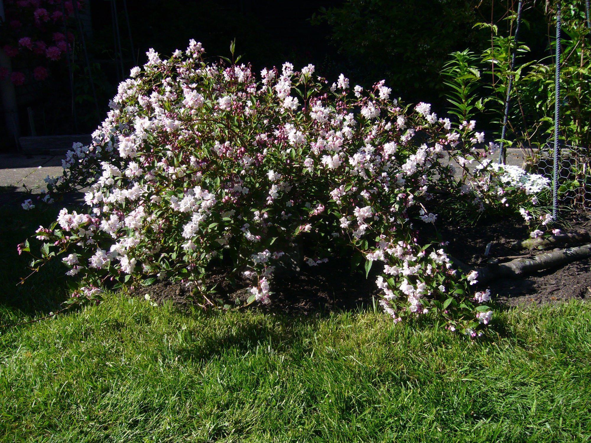 Durch den bogig-überhängenden Wuchs ein einziger Blütenberg: Kalmiendeutzie. Gerne von Bienen besucht.