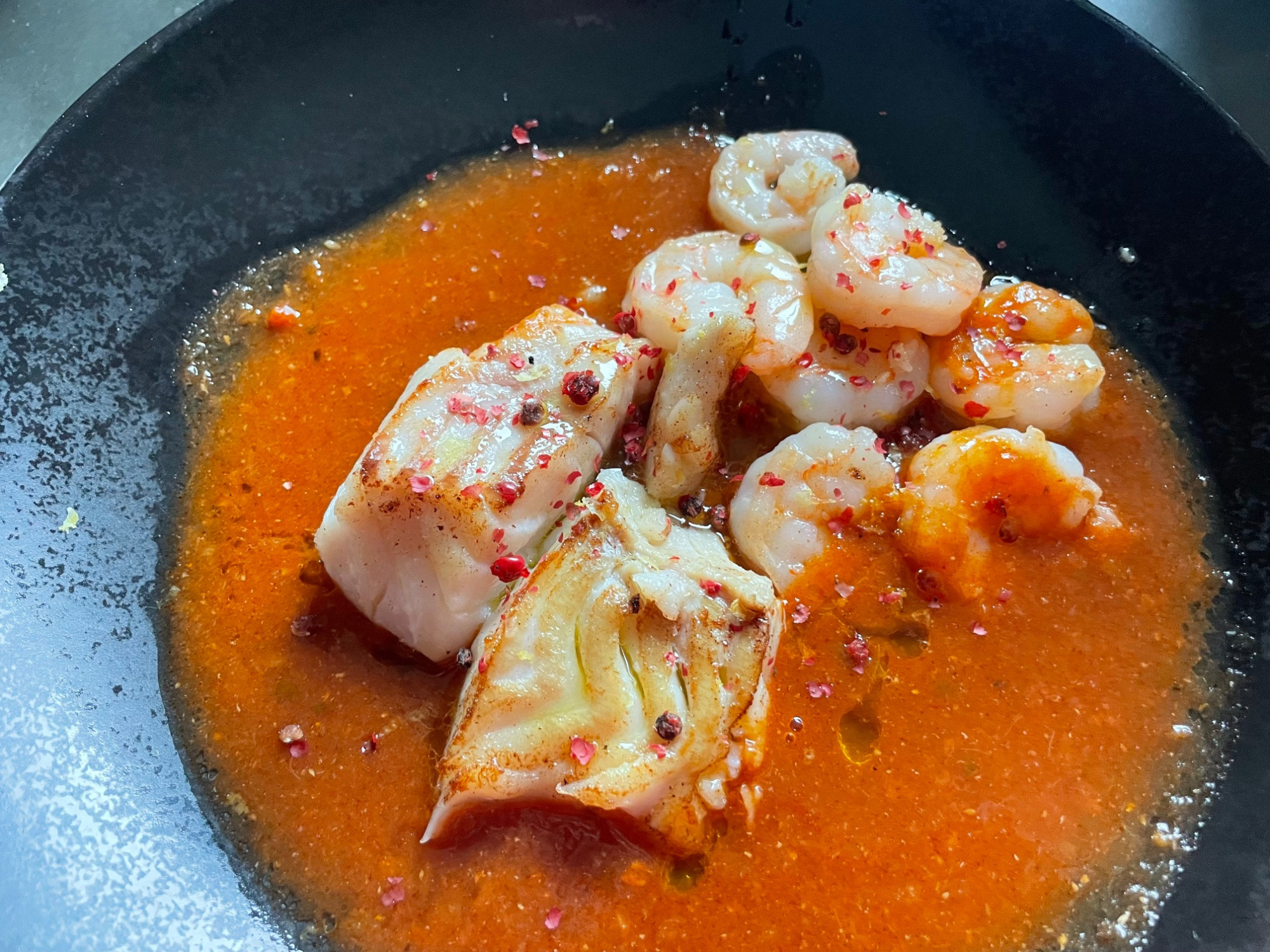 Kabeljau uns Garnelen mit Estragon und Krustentierbisque. Die habe ich nicht nochmals durchgesiebt, deshalb sieht sie etwas grob aus.