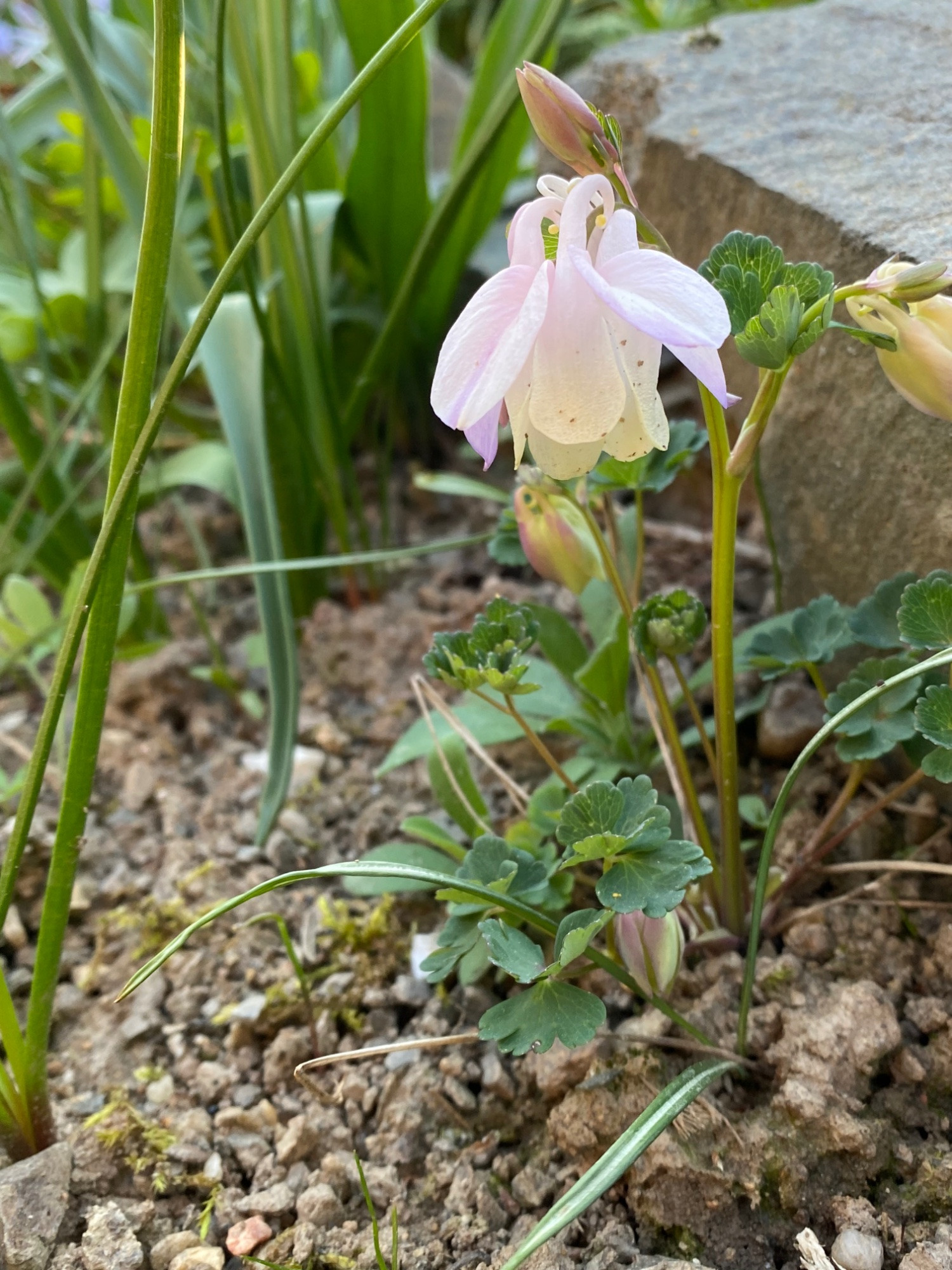 Hier sind die Akeleien noch nicht so weit. Nur 'Miss Huish' blüht. Und die Rosenkugel verrät, dass ich wie immer 'quick and dirty' mit dem Smartphone fotografiere.