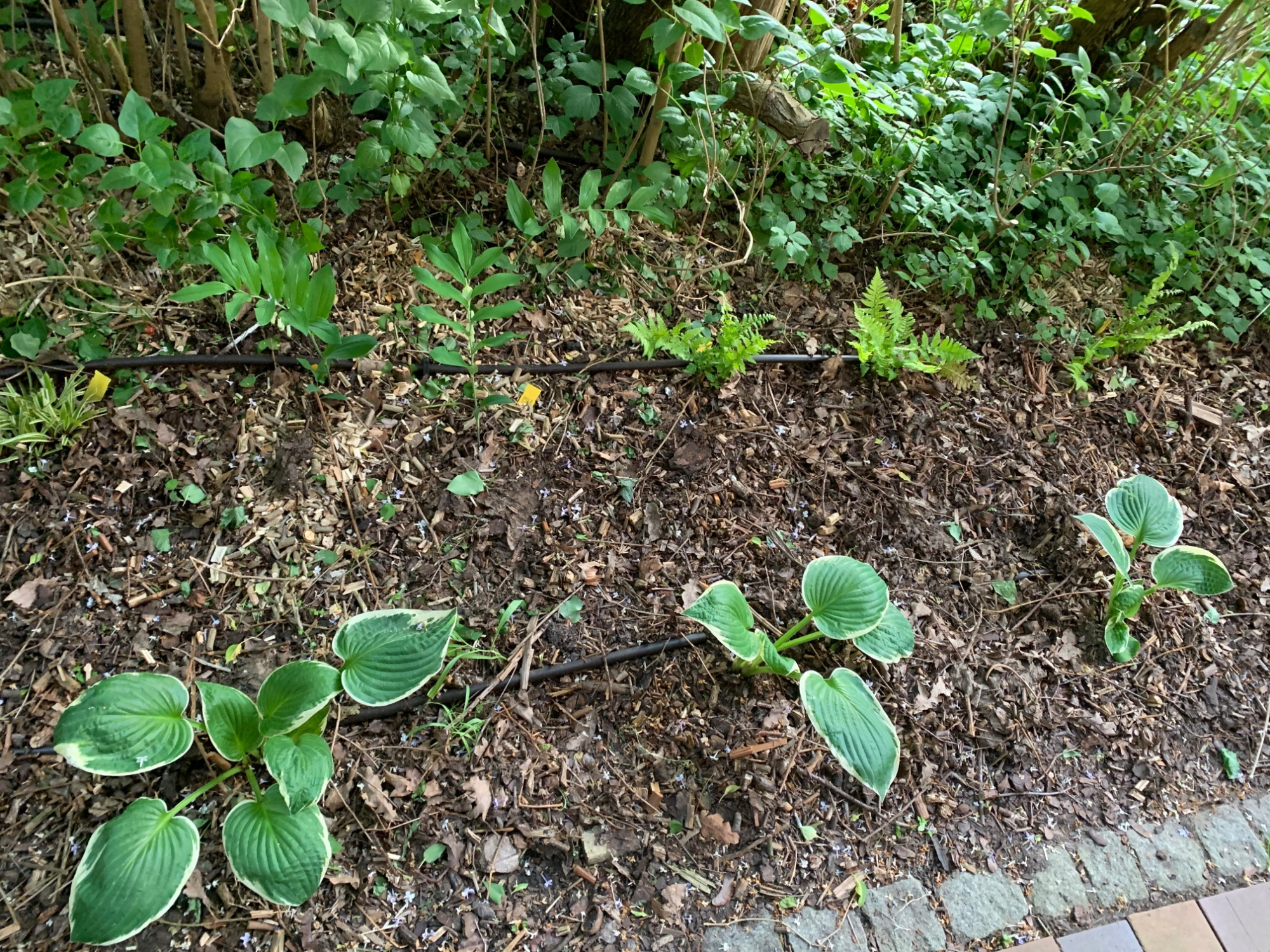 Die eine Lücke in den Hostas ist gar keine. Da wächst nur jemand sehr verspätet. Das habe ich aber erst beim Pflanzen gemerkt und deshalb gibt es jetzt ganz hinten im Garten auch eine Hosta am Hühnergehege.