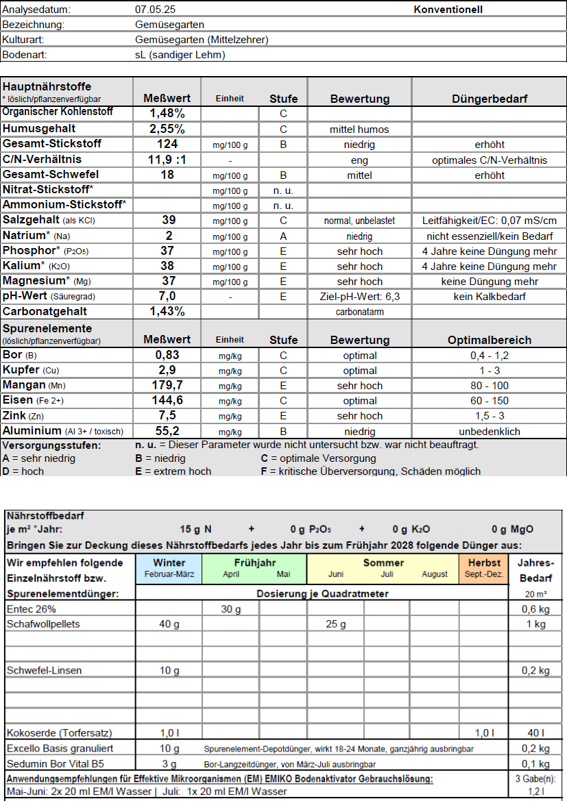 Auf den ersten Blick, die Werte zeigen einen typischen Gartenboden, wie man Garten zB in den 60er Jahren letztes Jahrhundert gedacht hat. Überhöhte Werte bei den Kernnährstoffen, aber durch zu viel Bearbeitung und `alles wertvolle rausfahren´ den Boden für die nächste Generation versaut. Deshalb der niedrige Humusgehalt und wenig Ertragspotential bei gleichzeitiger Überdüngung. So gehts halt nicht.