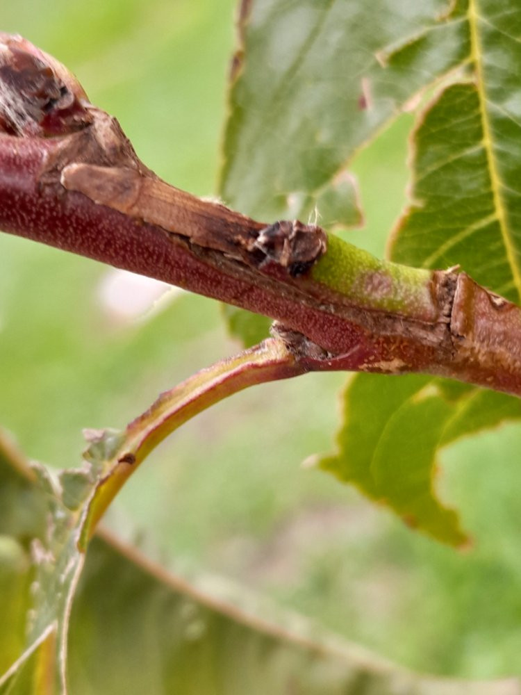 Die Ästchen haben sich nie richtig von dem Eingriff erholt. Ich muss dazu sagen, dass mein Pfirsich, hab nur den einen, ziemlichen Krankheitsdruck mit Schrotschuss hatte. Und welcher Pfirsich oder Aprikose ist nicht mehr oder weniger mit Pseudomonas geplagt. Wenn ich nochmal aus wäre auf einem Mehrsortenpfirsich würde ich vlt. auf eine scharkatolerante Zwetschge die verschiedenen Sorten veredeln.