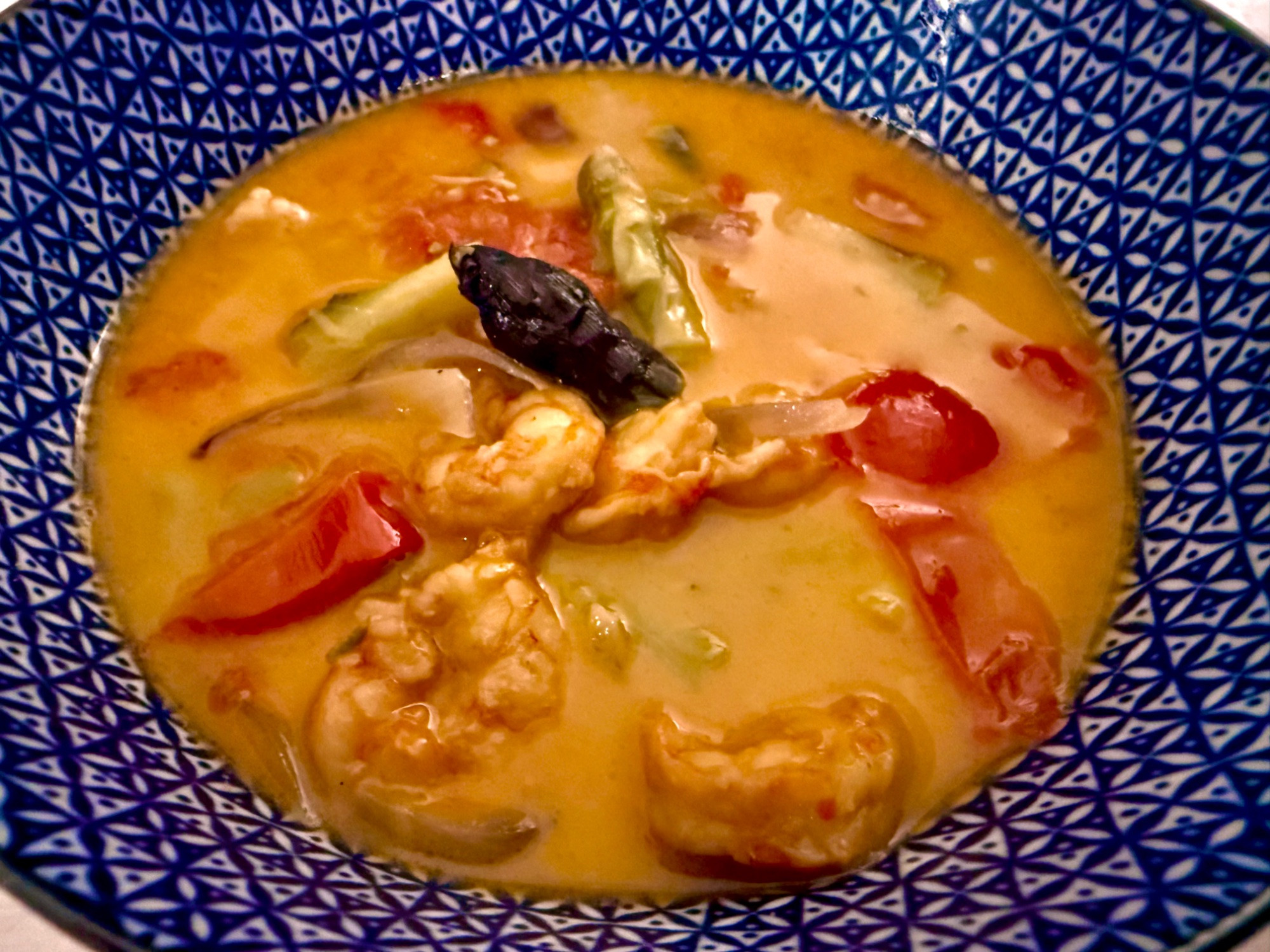 ich hatte zunächst knoblauch, rote zwiebel und gartenspargel vorbereitet und geschnitten (spargel in köpfe und abschnitte sortiert), den knoblauch angebraten, etwas tom kha-paste mitgeschmort, ein klecks tomatenmark dazugegeben, kurz angeröstet, gartenchili-sambal oelek dazugegeben, die rotgarnelen dazugegeben, wegmussgartenspargelschalensud vom letzten spargelessen aufgegossen, mit palmzucker und fischsauce abgeschmeckt, spargelabschnitte dazugegeben, flüssigkeit ca. 10 minuten eingekocht, kokosmilch dazugegeben, spargelköpfe dazugegeben, ca. fünf minuten weiter eingekocht, kurz vorm servieren die roten zwiebeln und tomaten dazugegeben – fertig. limettensäure hat mir erstaunlicherweise nicht gefehlt, hätte aber gepasst.