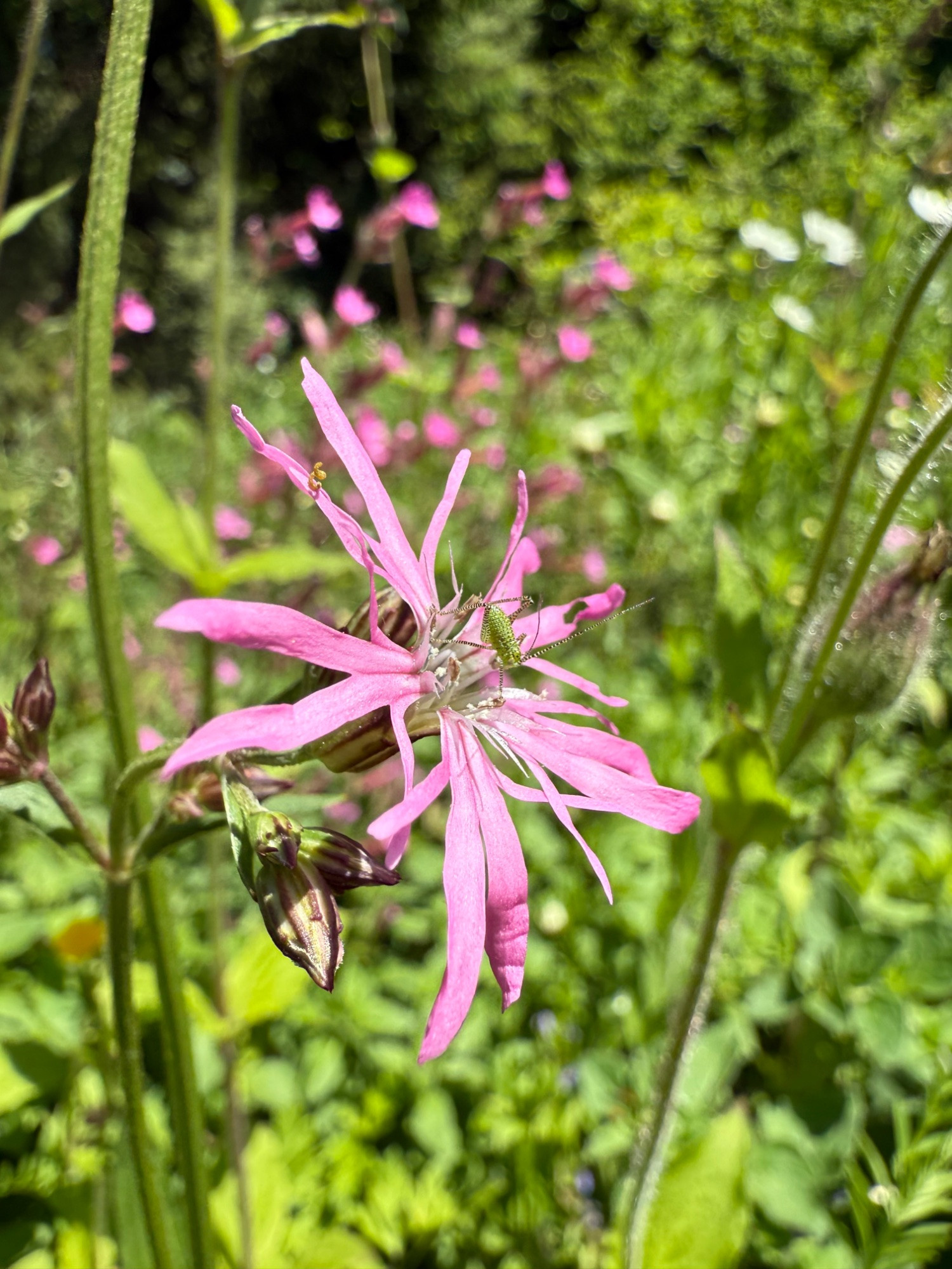 In der Wechsel feuchten Wiese dominiert aktuell die rote Licht Nelke, ein paar Kuckucks Licht Nelken gehen darin etwas unter