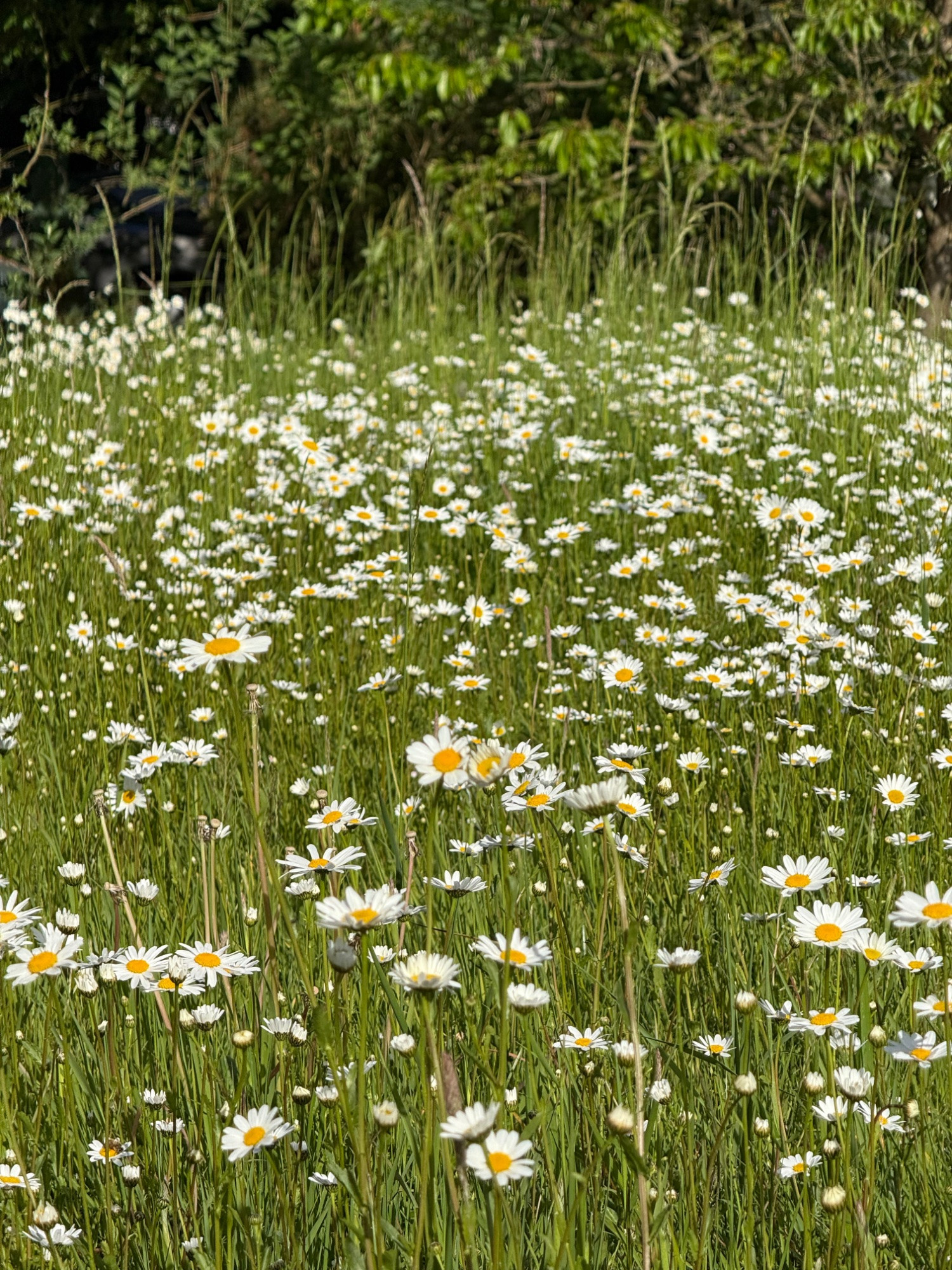 Hier sieht es aktuell so aus meistens Margeriten dominiert. in Ein Paar Flächen noch Ackerwitwen blume Nelken und Rhinantus enthalten.
