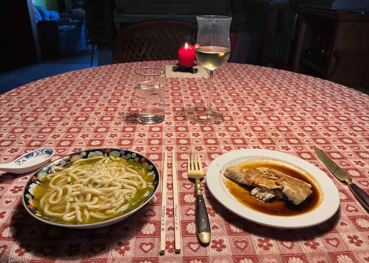 Zander, asiatisch mariniert und gedämpft, sowie Udon-Nudeln mit Frühlingszwiebeln zum Sauvignon blanc 2021 "Eva" aus Neuseeland