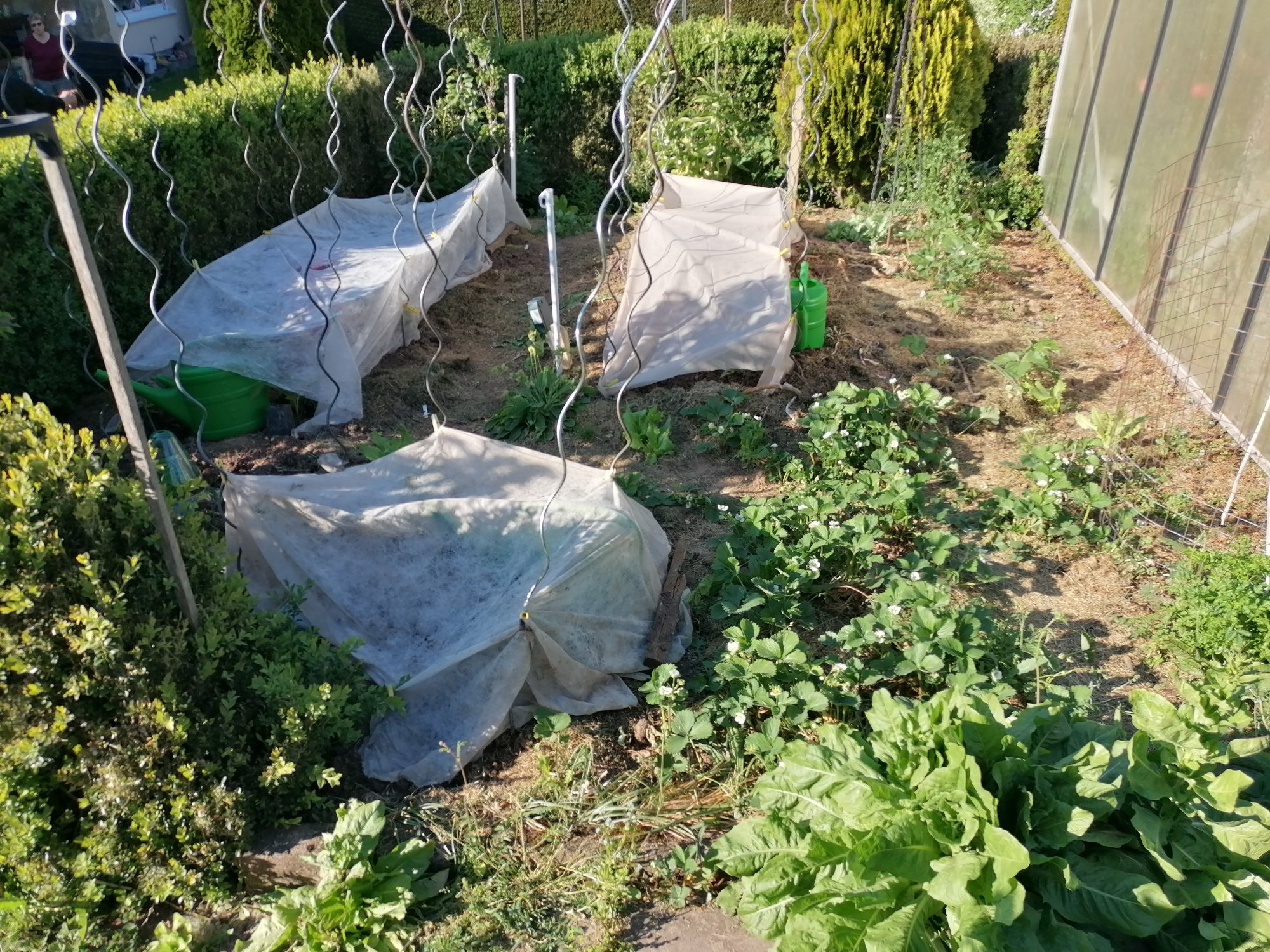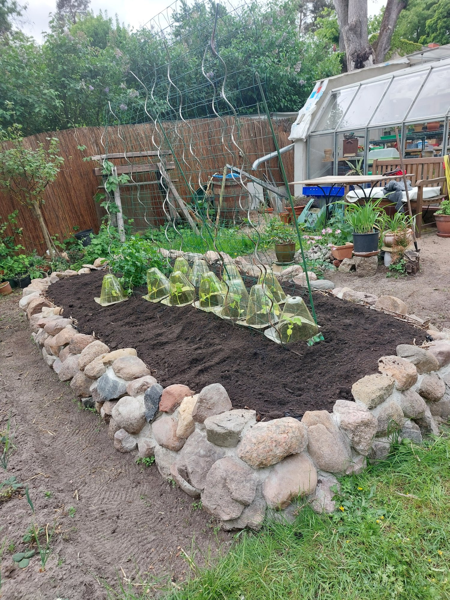 Da es endlich geregnet hat, habe ich heute gewerkelt, Bohnen 'Merveille de Piemonte' gesteckt, mit Vlies abgedeckt, Türkische Landgurken, Zucchini 'Tondo di Piacenza' und 'Blue Hokkaido' gesteckt und Schutzglocken übergestülpt.