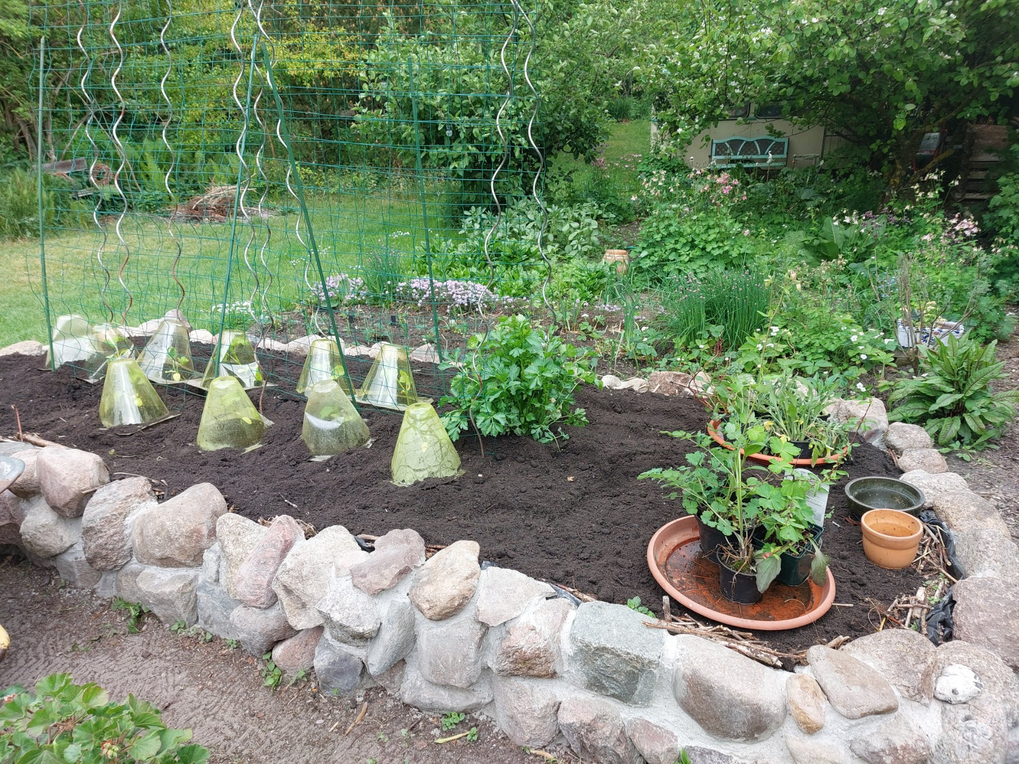 Da es endlich geregnet hat, habe ich heute gewerkelt, Bohnen 'Merveille de Piemonte' gesteckt, mit Vlies abgedeckt, Türkische Landgurken, Zucchini 'Tondo di Piacenza' und 'Blue Hokkaido' gesteckt und Schutzglocken übergestülpt.