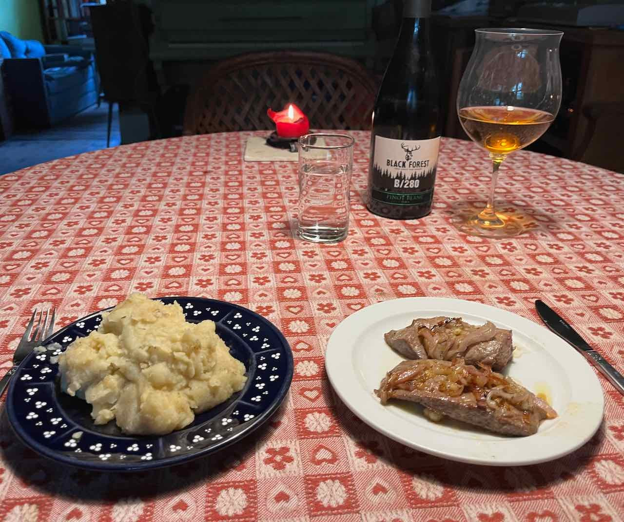 Kalbsleber venezianisch mit Zwiebeln, in Butter und Olivenöl gebraten und mit Weißwein abgelöscht sowie Kartoffelpüree mit Rosmarin zum Pinot blanc "Black Forest". Einen Teil der Leber habe ich mit Sojasoße mariniert, Geschmack verstärkt. Zur Leber gehört eigentlich Rotwein, aber der "Black Forest" mit seiner zweifachen Kelterung ist recht stark.
