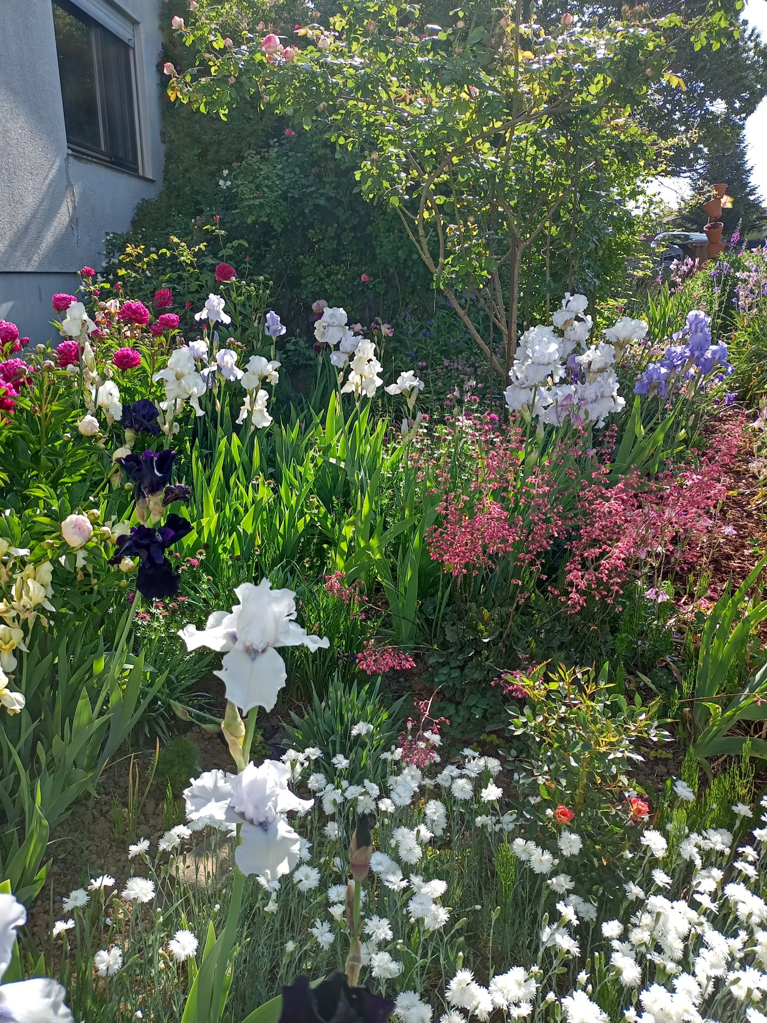 Ich finde die Fotos von den gemischten Beeten ebenfalls sehr gelungen und schön anzusehen. Warum immer nur eine Irisblüte zeigen? Ein nur reines Irisbeet finde ich langweilig. Es sei denn, man züchtet, verkauft, o.ä. Nachher hat man nur noch die Schwerter stehen und nichts anderes blüht. Ich finde die Kombination mit Hemerocallis spannend. Die kommen ja normalerweise, wenn die Irisse verblüht sind. Ich pflanze noch gesäte Einjährigen dazwischen, wie Hibuscus cannabinus, Ceratotheca triloba, rosa und weisse Sommenblumen und einiges an Monardas stehen auch noch dazwischen. Aber wie heisst es hier? Jeder Jeck iss anders
