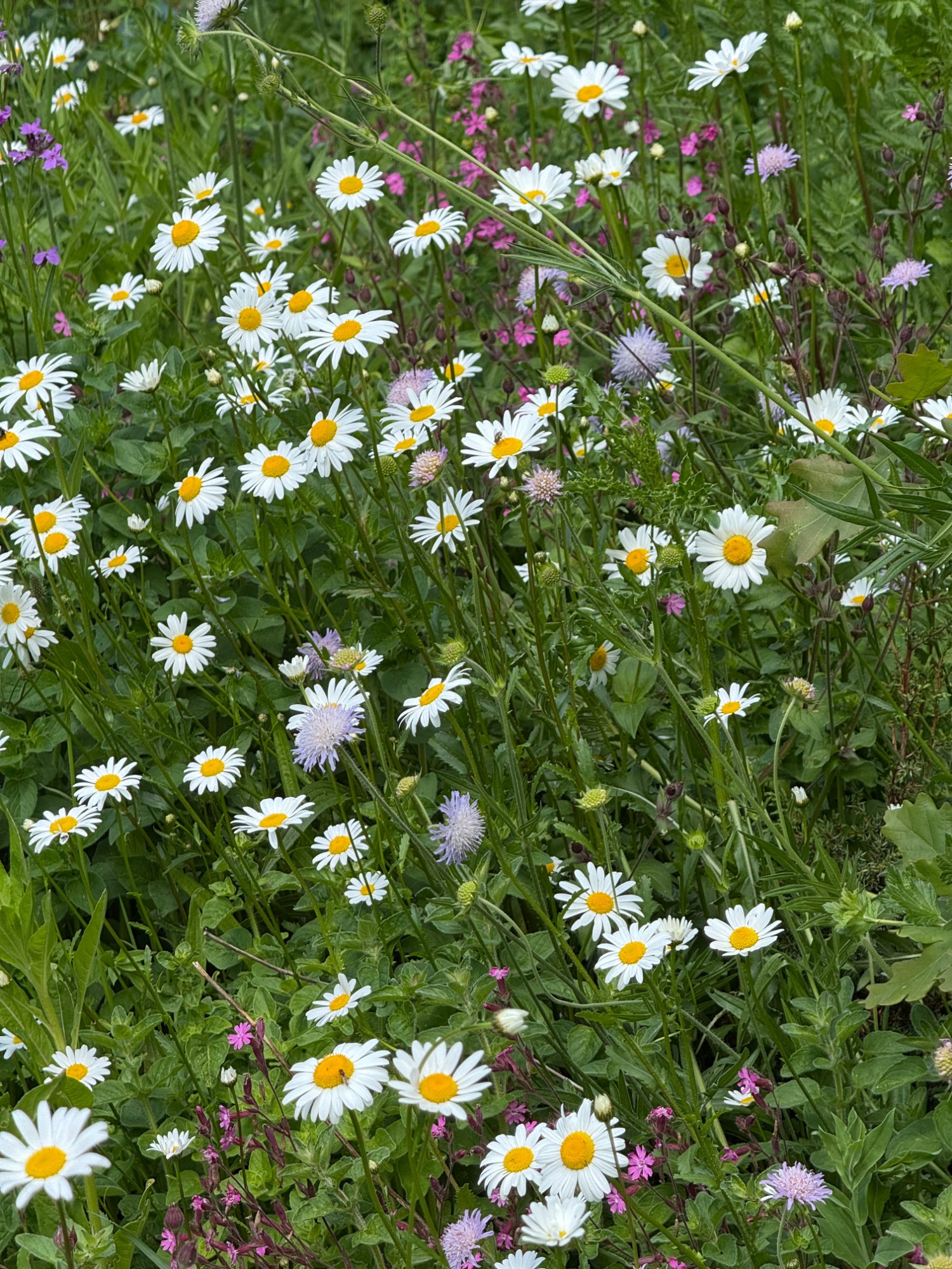 Hier sieht es aktuell so aus meistens Margeriten dominiert. in Ein Paar Flächen noch Ackerwitwen blume Nelken und Rhinantus enthalten.
