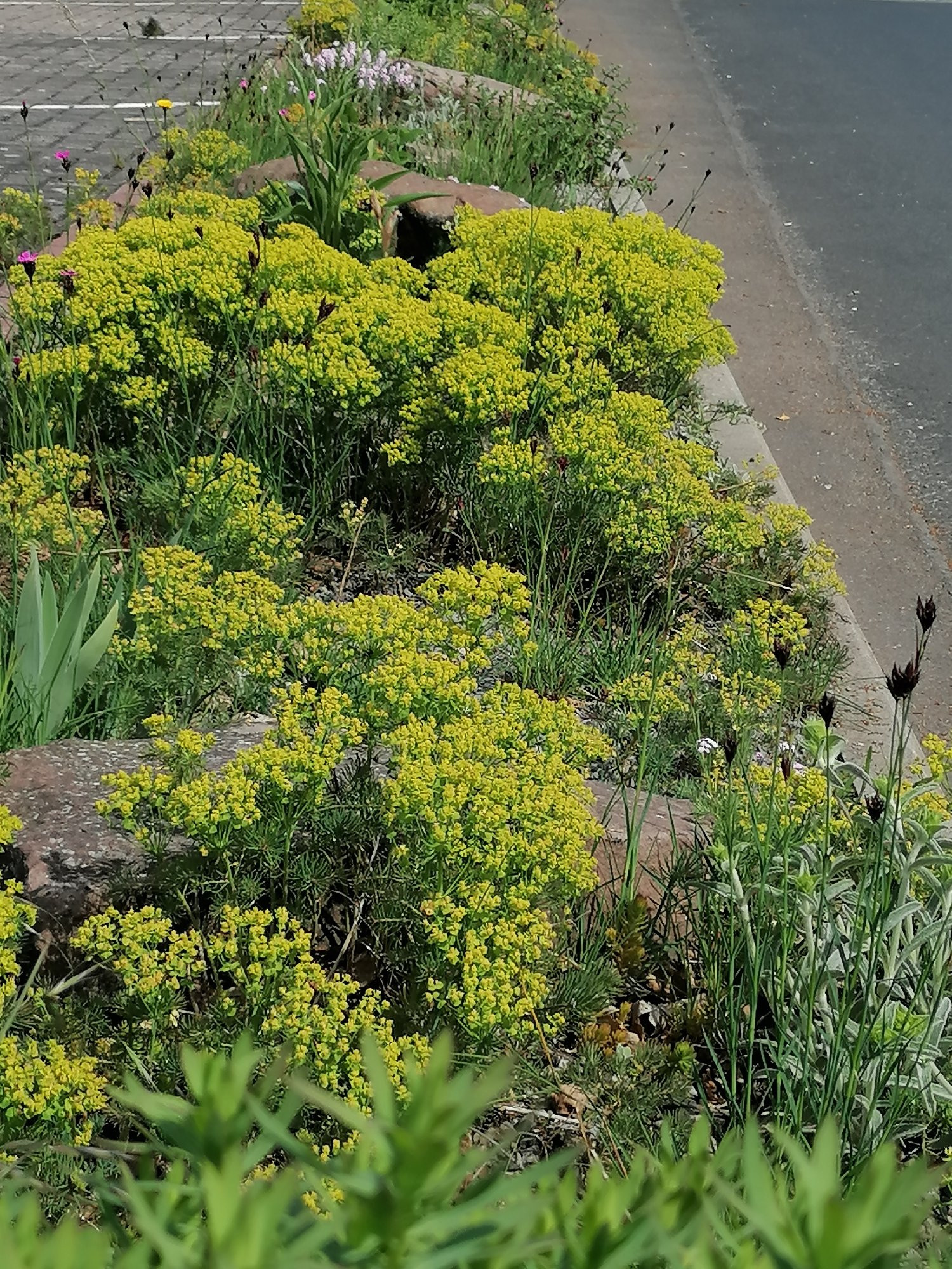 Momentan dominiert Euphorbia 'Fens Ruby' und Aethionema 'Warley Rose'.