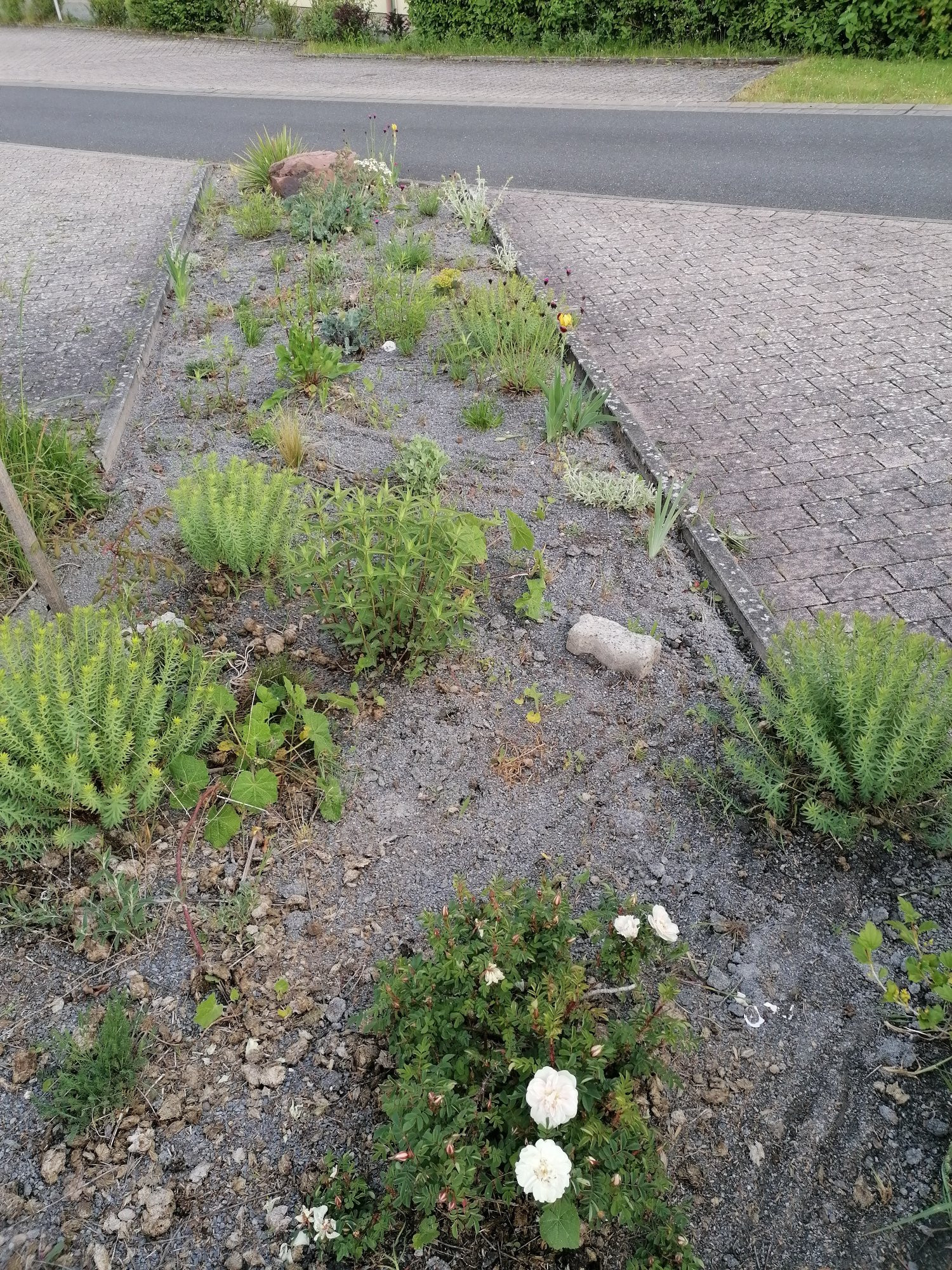 Kies im Öffentlichen Grün. Habe heute etwas gejätet, das bisschen Regen heute Nacht muss ausgenutzt werden, geht's leichter raus. War aber kaum feucht geworden.