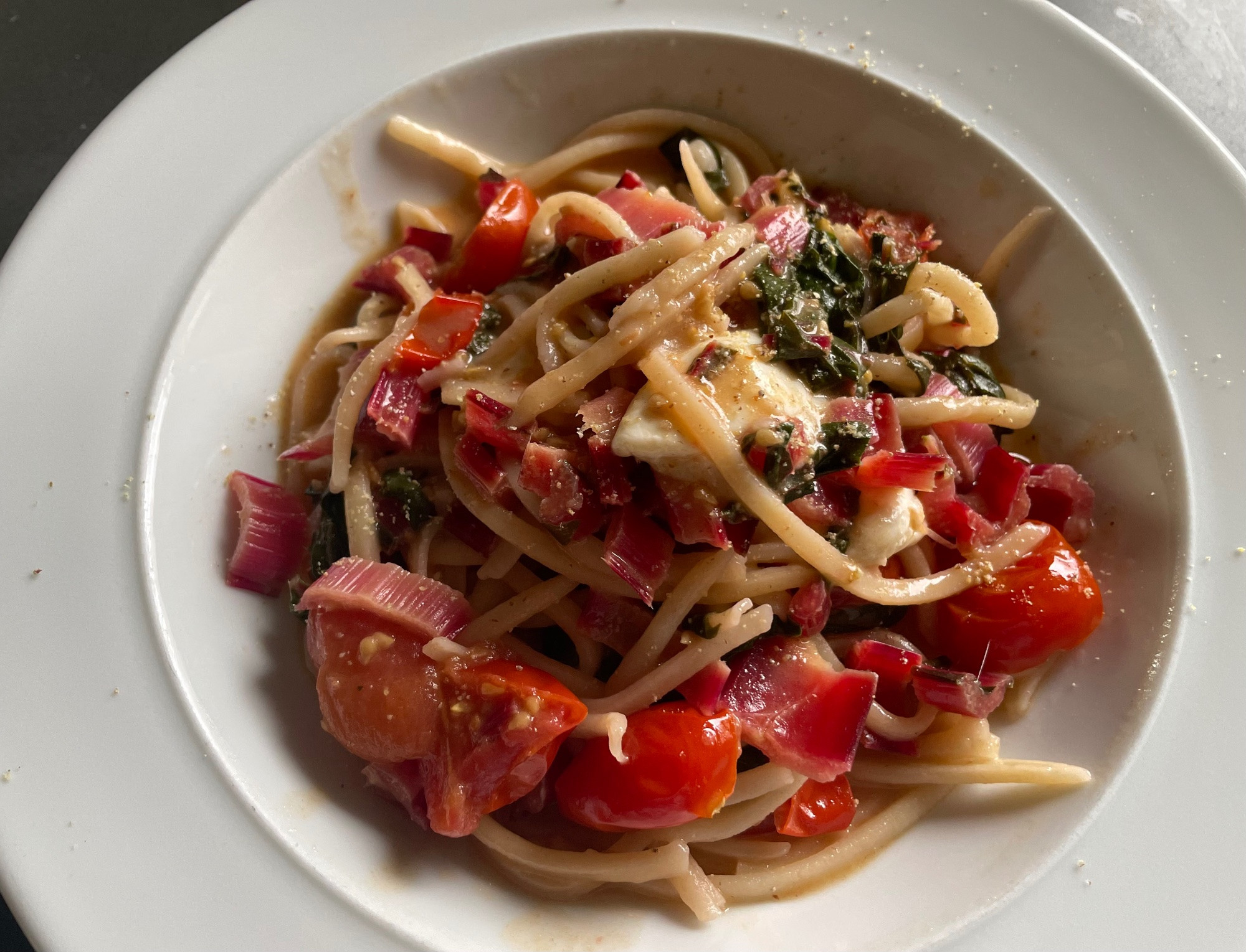Hier gab es gestern eine Liblingspasta: Linguine mit Mangold, Cherry-Tomaten, Sardellen und Mozzarella