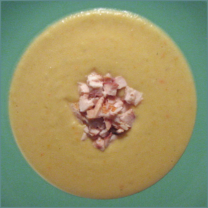 1 kleine Zwiebel fein gehackt1 Knoblauchzehe gepresst1 Teelöffel frischen Ingwer fein geriebenca. ½ Teelöffel abgeriebene Zitronenschale400 g gehackte Tomaten (Dose)4 dl Gemüsebouillon½ Mango in kleine Würfel geschnitten1 Prise ZuckerSalz und Pfeffer aus der MühleCayennepfeffer1 – 2 Esslöffel Rahm zum verfeinernDie Zwiebel in wenig Öl dünsten, Knoblauch und Ingwer kurz mitdünsten, mit der Bouillon ablöschen, die restlichen Zutaten beigeben, weich kochen , pürieren, mit 1 - 2 Esslöffel Rahm verfeinern