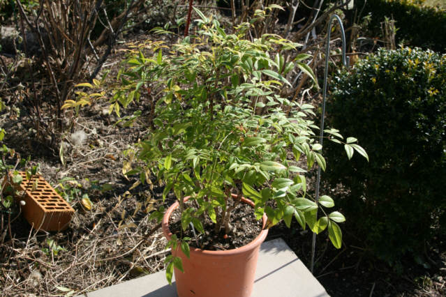 Habe durch einen Zufall ein mir unbekanntes Gehölz, Nandina im letzten Jahr erstanden. Mir gefiel besonders die Blattform des kleinen Strauches. Der Verkäufer konnte mir nur mitteilen, das man das Gehölz auch als heiliger Bambus bezeichnet und ca. 1,5 m groß werden kann. Der Strauch verträgt absolut keinen Frost und ist demnach nicht winterhart. Aus diesem Grund bezog er sein Winterquartier in der Garage. Am Tage stelle ich jetzt den Strauch ins Freie und er sieht, trotz langen Aufenthalt im Winterquarier, noch wunderbar grün aus.Hat jemand von Euch schon einmal das Gehölz gepflegt und kann kurz seine Erfahrungen mir mitteilen ?Fuliro