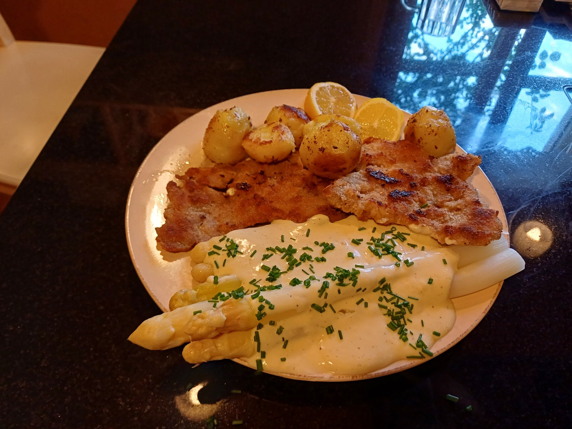Hier gab es gestern Abend für lieben Besuch weißen Spargel mit Butter, leichter Scnittlauchmayonnaise und Kartoffeln. 1,5 kg für drei war reichlich, zumal mit Dessert: Vanilleeis mit Erdbeeren, Waffeln und Grand Marnier. Heute Vanillerostbraten mit Erdäpflpürree und Grazer Krauthäuptlsalat. Sehr gut