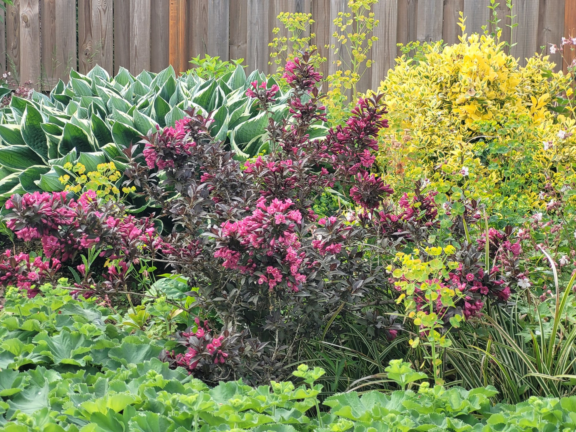 Es blüht nun diese kleine, dunkellaubige Weigelie vor dem V. Mariesii... in ca. 9 Jahren vielleicht 1m hoch gewordenen und sicher nichts Besonderes. Trotzdem hübsch... wie ich finde.