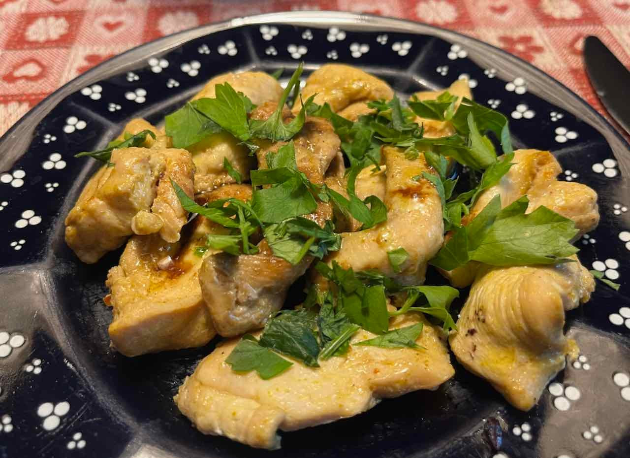 Maishähnchen-Brustfilet mit Meersalz, Pfeffer, Paprika, Kurkuma, Knoblauch und Sojasoße mehrstündig mariniert, über Weinschorle gedämpft sowie schwarzer Reis "Nerone 2" aus dem Piemont mit Butter und "Reisparfüm" gedämpft zum Cabernet Sauvignon 2002 aus Mendoza, Argentinien