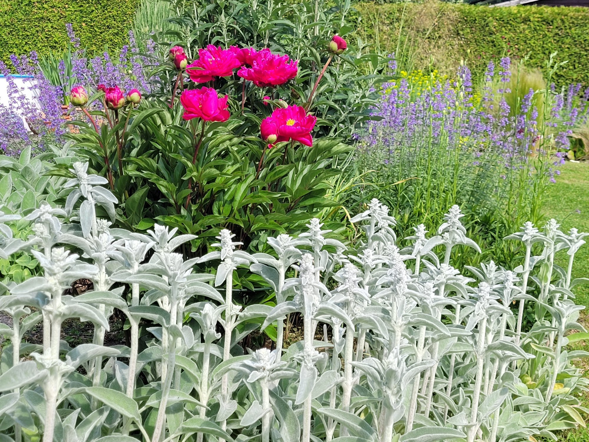 Nun holt das 'Präriebeet ' mit der Paeonien Blüte mächtig auf, die Rosen zeigen erste Blüten, während die Irisblüte im 'Steppenbeet ' langsam dem Ende zugeht. Trotzdem mag ich diese Pflanzung mit dem nun vollen Gräsergewusel hier jetzt fast immernoch am liebsten.