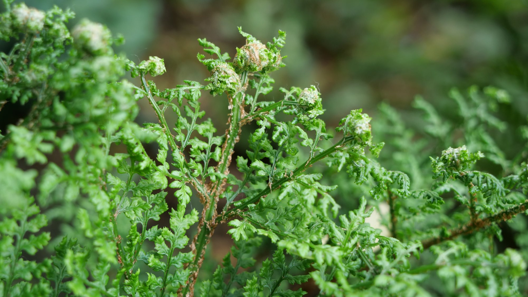 Polystichum setiferum 'Nantes ' produziert auf den frischen Wedeln bereits zahlreiche Kindel.