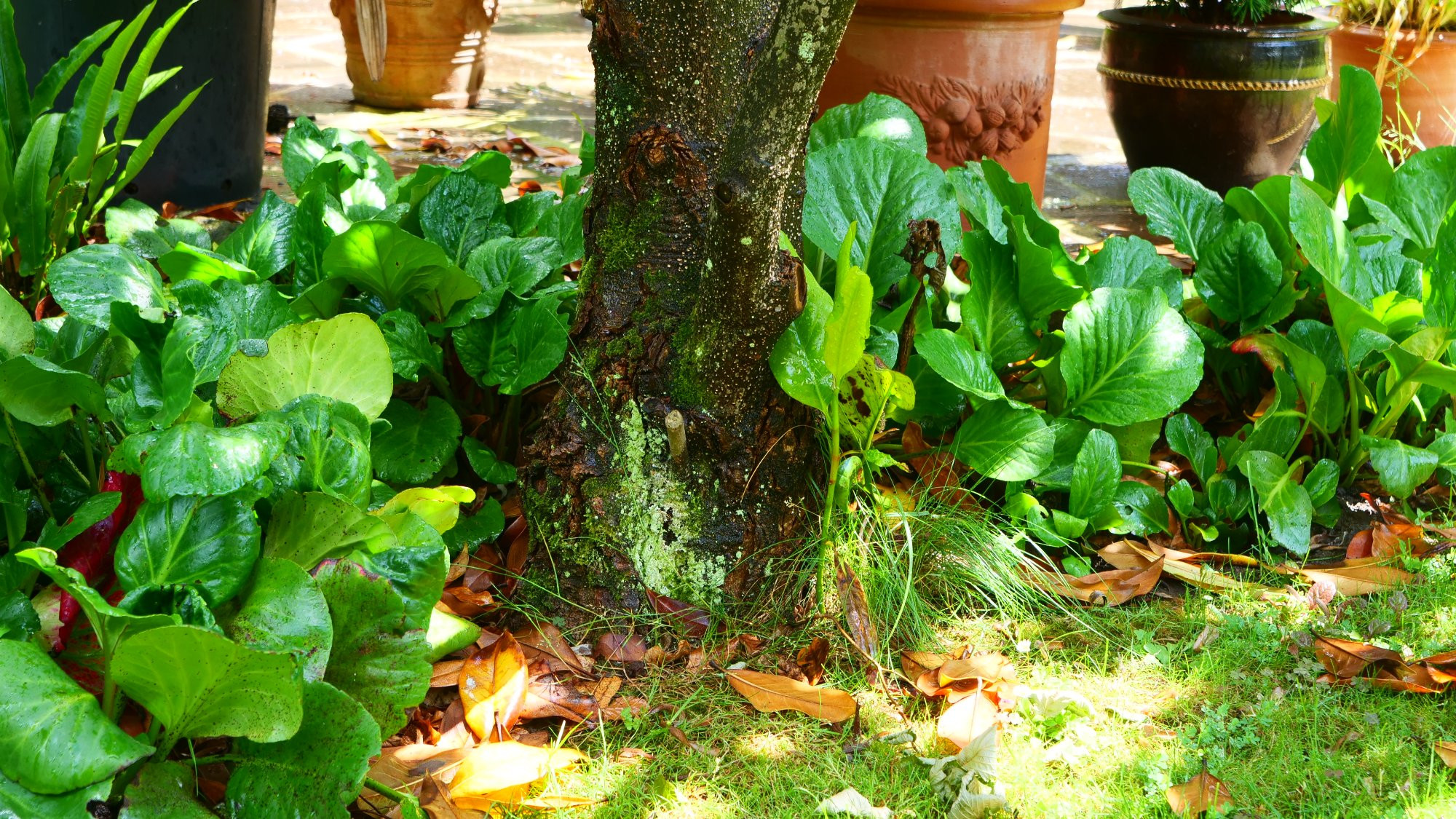 Dieses Jahr 'mausert ' sich unsere Magnolia grandiflora mal wieder. Das Beet und der Rasen darunter sind von den fast holzigen, trockenen Blättern bedeckt. ( Der Rasen wurde bereits mehrfach abgeharkt)