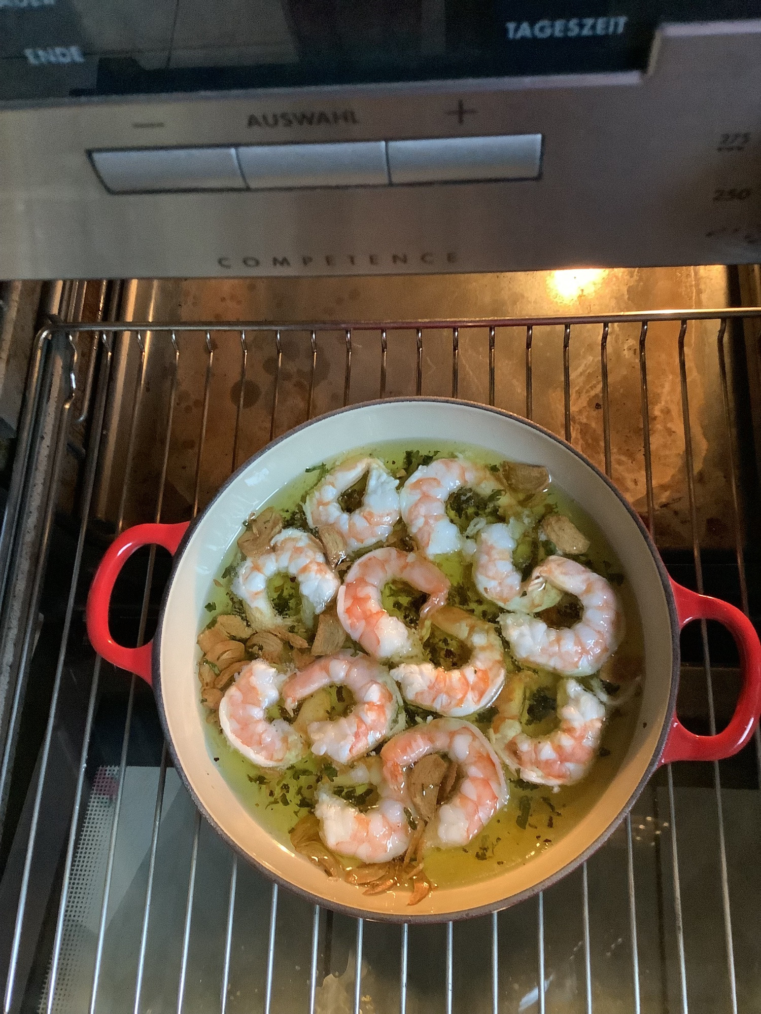 gebackenen Ziegenkäsetaler, fette Shrimps in Knobiöl gebraten, Weißbrot kühlt grade ab