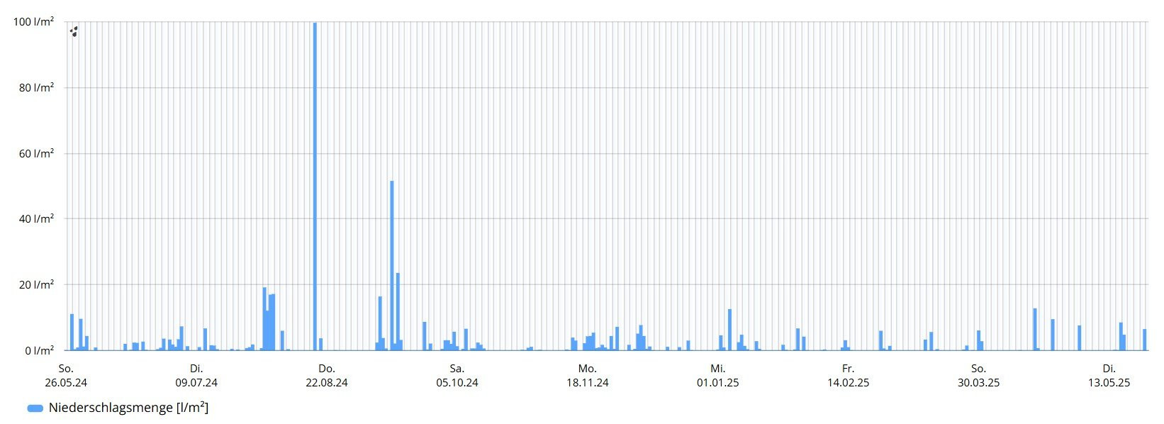 In diesem Jahr gabs bisher zweimal mehr als 10 Liter/m², einmal im Januar, einmal im April.