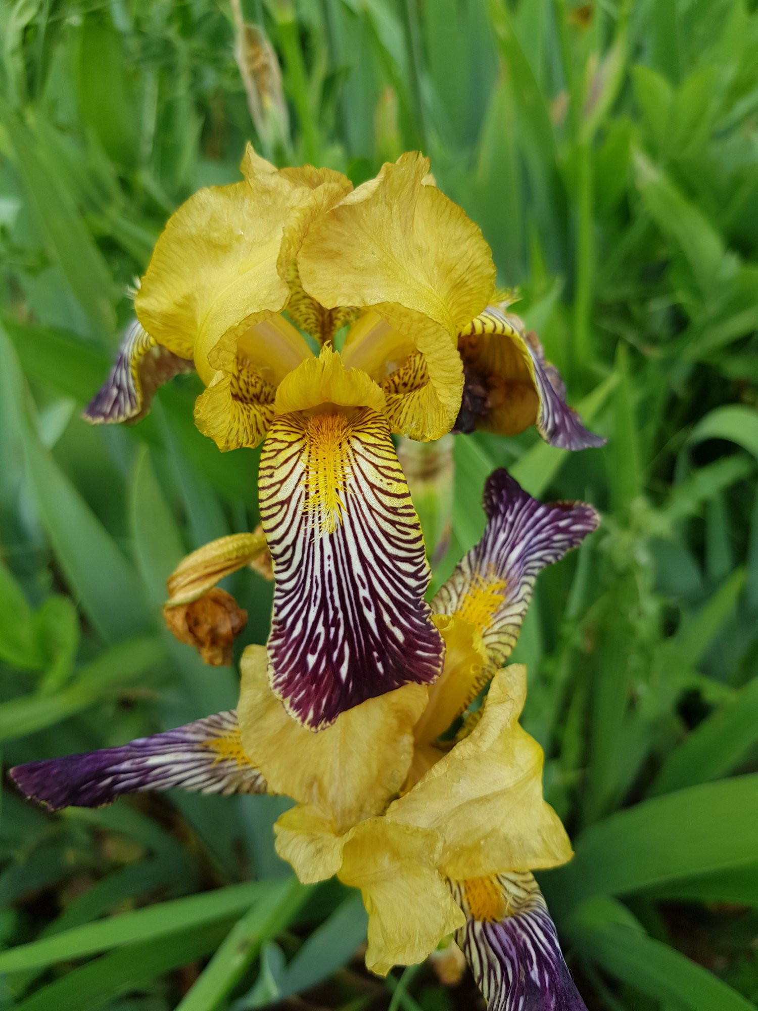 Statdessen habe ich diese Iris (s. Fotos) blühend gefunden. Sie wachsen nur an einer Stelle (außerhalb der Ortsbebauung) und könnten natürlicherweise dort hin gekommen, aber durchaus auch ausgesetzt worden sein. Meine Pflanzenbestimmungs-App kennt die Iris nicht, bestimmt sie nur als "Deutsche Iris".