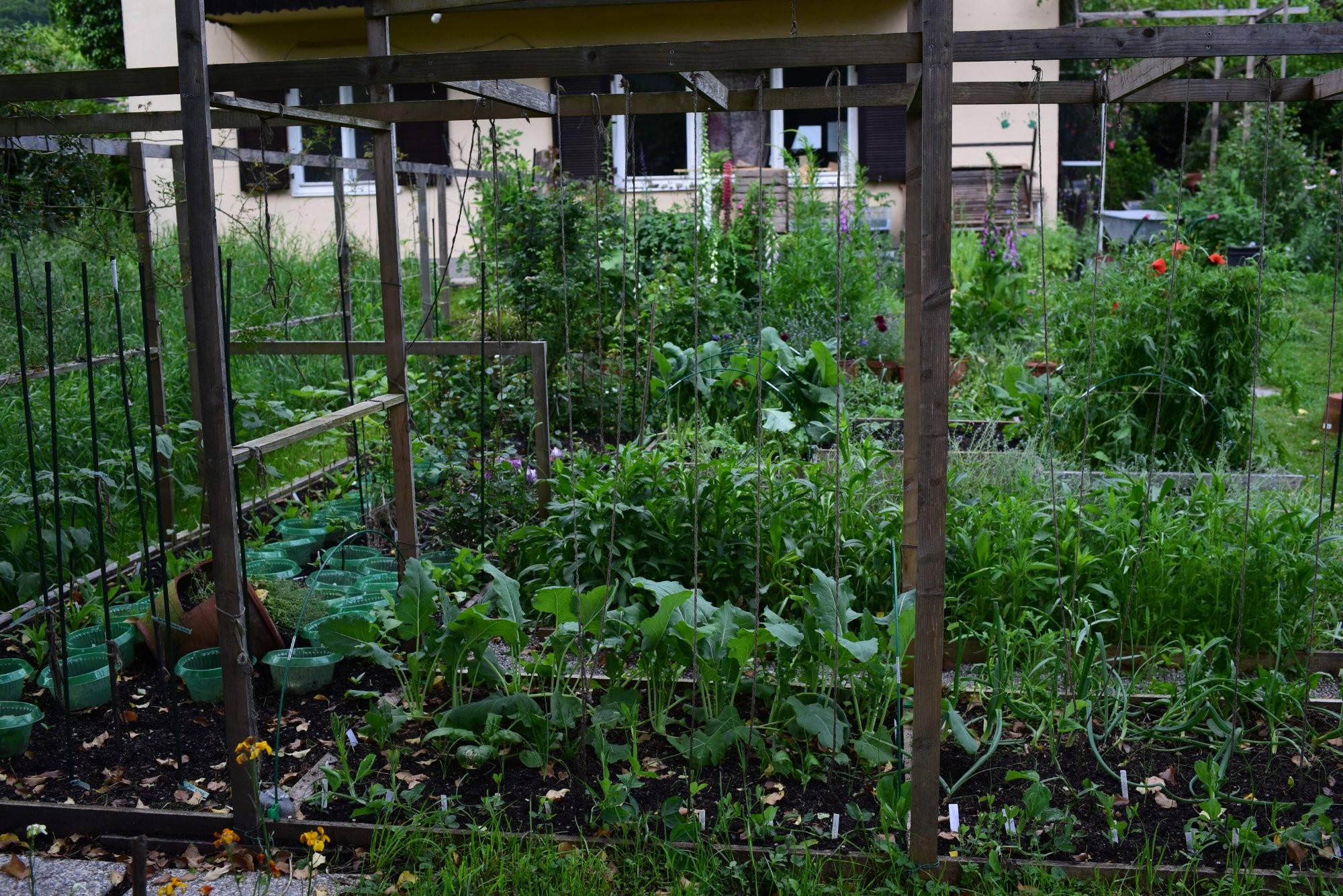 Das ging eigentlich ganz gut. Wegen der Braunfäule werden heuer nur Duftwicken an den Schnüren rauf wachsen, links kommen die Dahlien, ansonsten habe ich nur Fußvolk-Gemüse, weil ich mich nicht traue die Tomaten wieder da rein zu setzen. Ich werde die Pflanzsäcke an die SW Seiten des Hauses stellen und an der Unterseites des Balkons die Schnüre anhängen. Bei Rotkäppchen hoffe ich mit Stäben auszukommen. Vielleicht stell ich die auch auf den Balkon und lass sie runterhängen, sollte ja auch gehen, oder?