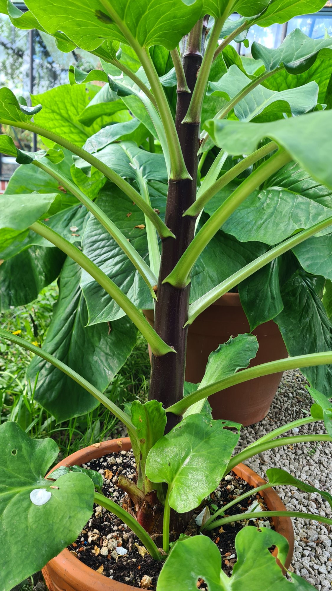 Cardiocrinum cathayanum, vor einigen Jahren ausgesät, treibt erstmalig einen Blütenstand. Der Dunkle Stängel gefällt mir schon mal sehr! Steht noch im Topf.