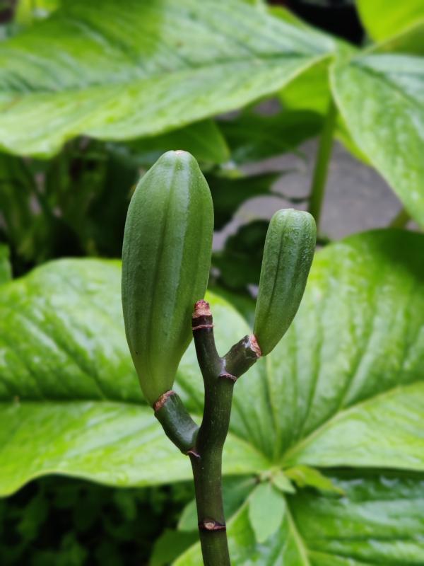 Cardicrinum cathayanum blüht nun. Der schwarze Stängel gefällt mir, aber insgesamt finde ich C. giganteum eindrucksvoller.