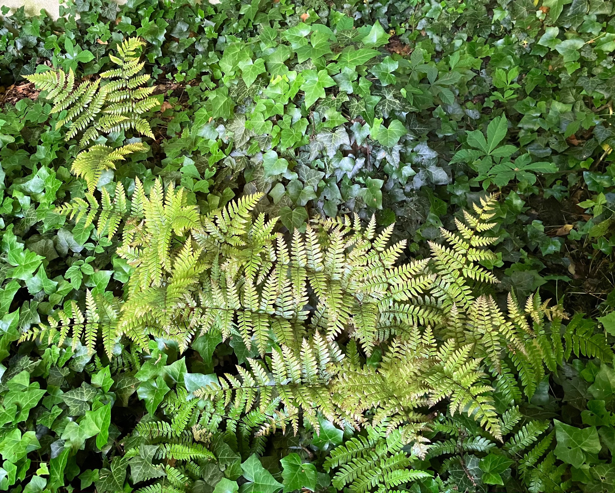 Rotschleier-, Wurm-, Hirschzungenfarn, mit Begleitstauden, - gehölzen.