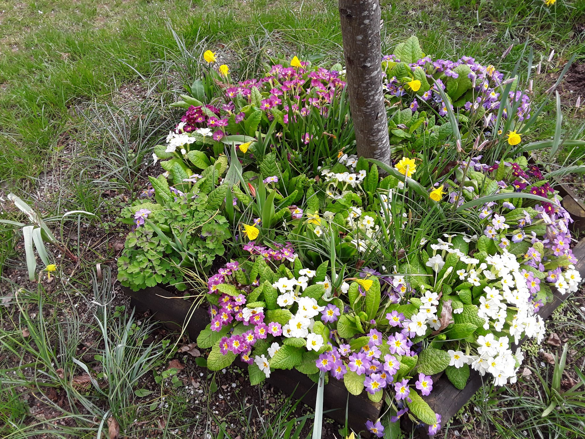 Buntes Allerlei in der Baumscheibe: Primeln und Narzissen.