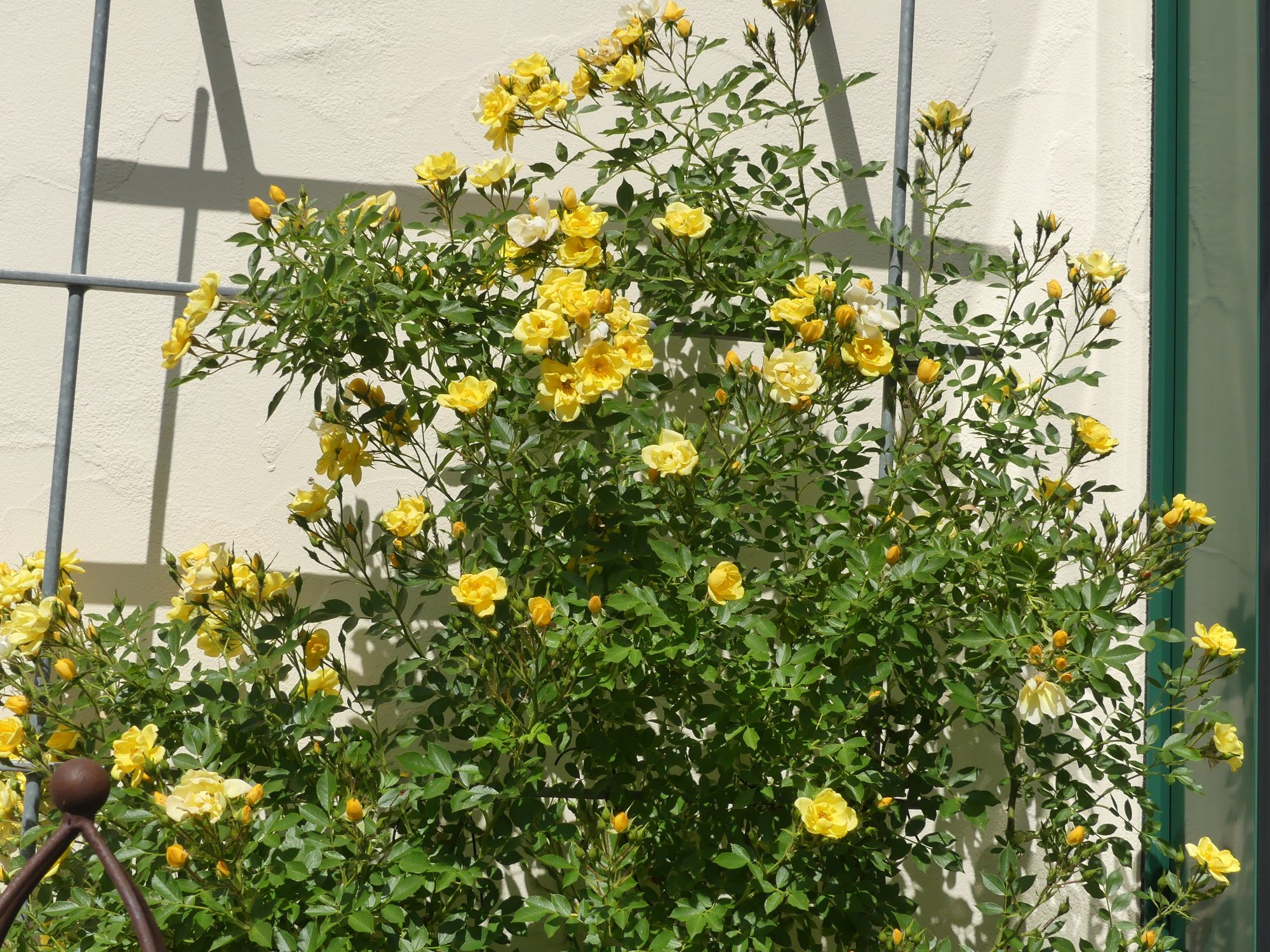 Francine Royneau, im Aufblühen Orange, verblasst zu Gelb. Sie macht sich dieses Jahr gut, allerdings bekommt sie nun Mehltau (und nicht nur sie!).