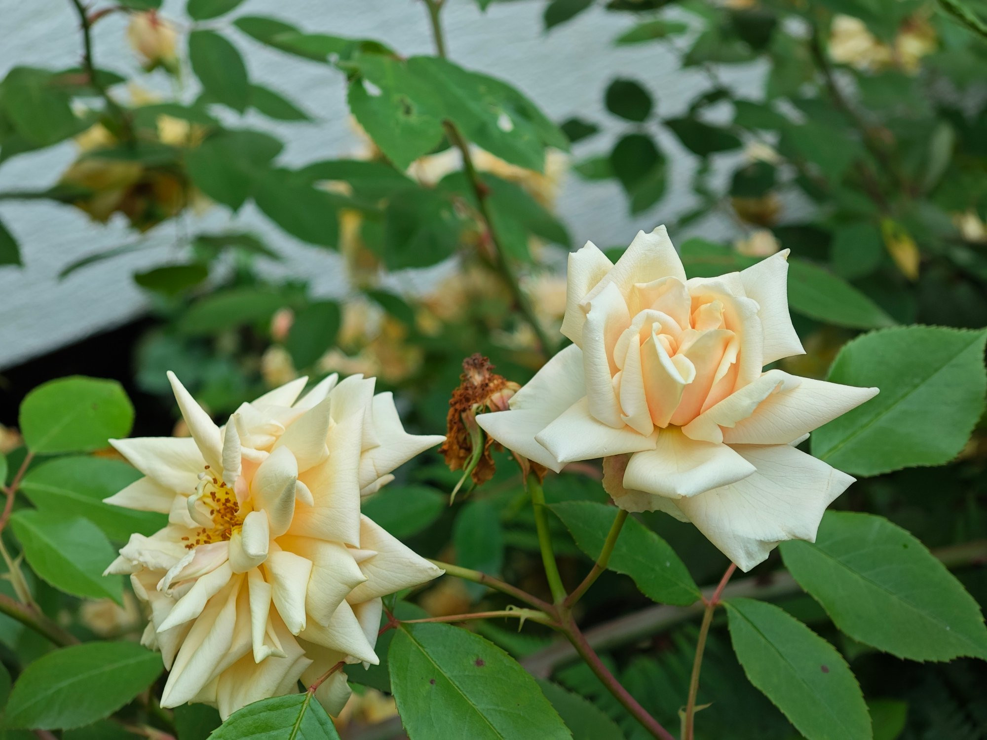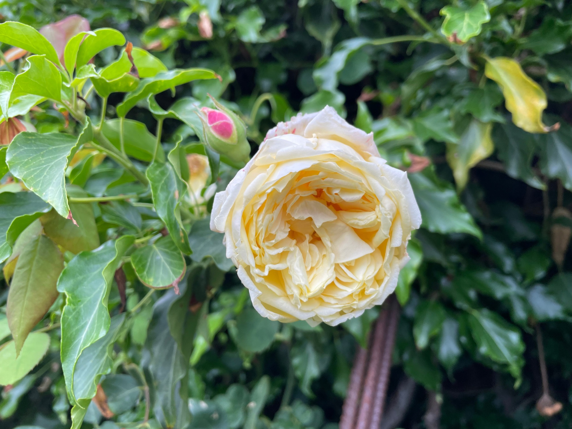Ha! Habe gerade erst den Teerosen Thread 2025 entdeckt! Hier geht es erst langsam los, nachdem es die vergangenen Wochen sehr kühl/trocken und nun - gottseidank - etwas regnerisch war. Devoniensis lässt sich noch Zeit... Die Solfatare habe ich vor 2 Jahren auf eine riesige Wildrosenwurzel gepfropft und anschließend mit Tomatenstäben vor dem Ausbrechen bewahrt...